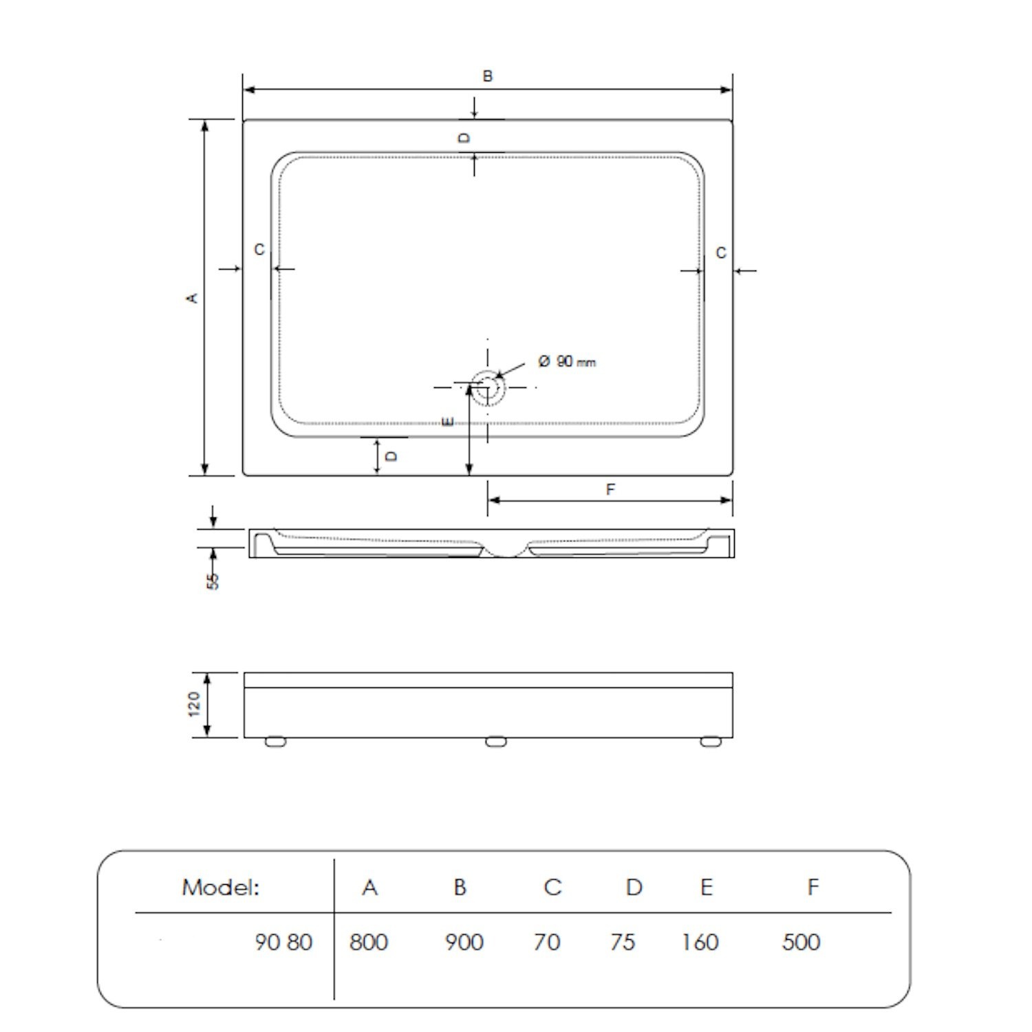 Moderne witte douchebak van het merk Boss & Wessing uit de serie Laveria is gemaakt van acryl. De rand van de douchebak is mooi afgewerkt met een plint, deze is inclusief. De douchebak heeft een afmeting van 90 cm bij 80 cm.