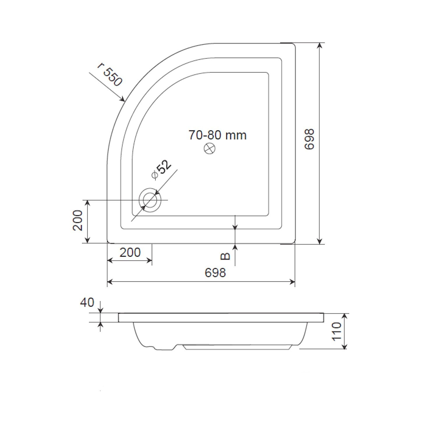 De douchebak heeft een afmeting van 70 cm bij 70 cm en een hoogte van 9 cm.