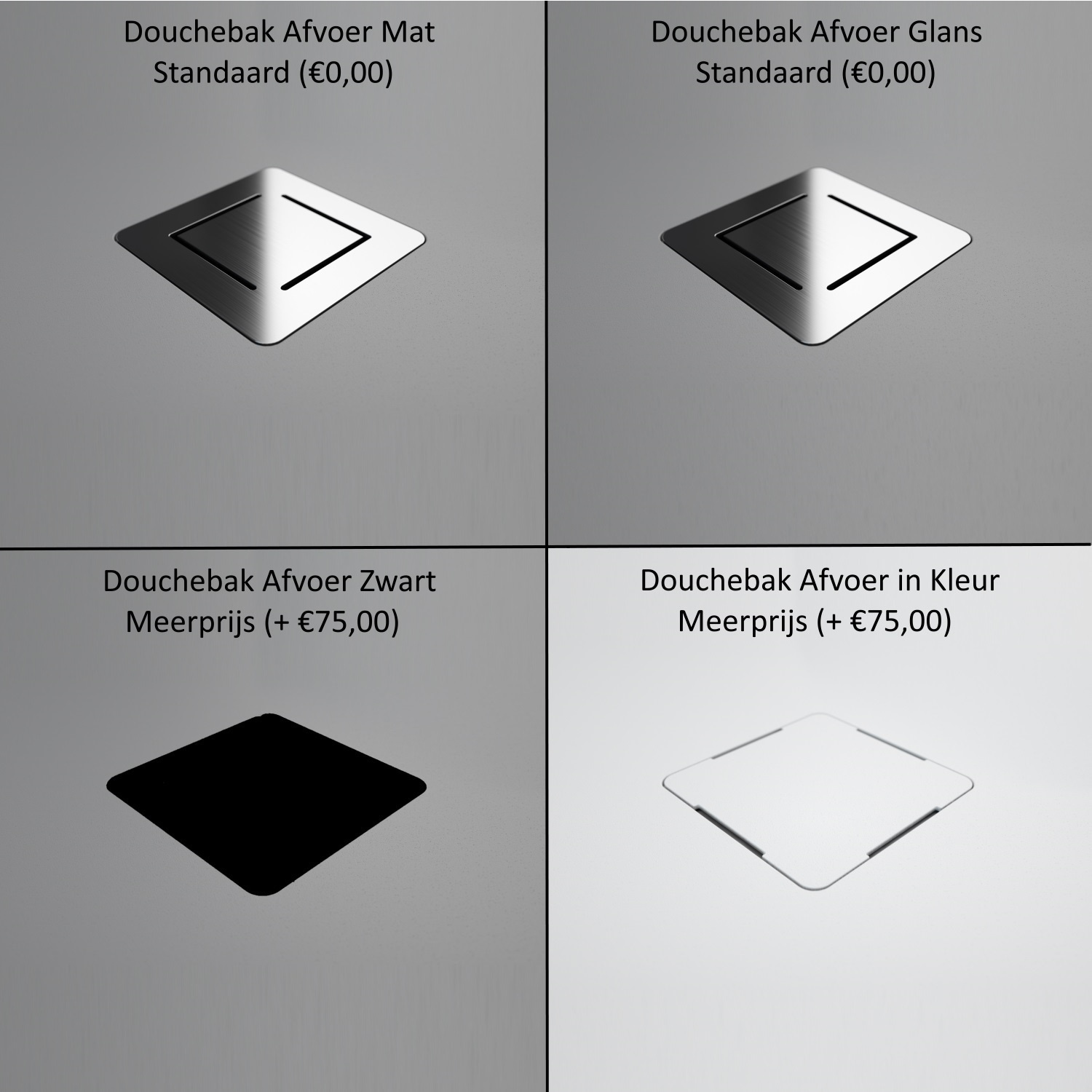 Voor een meerprijs van €75,00 heeft u bovendien de keuze om een zwarte afvoer te kiezen óf om een afvoer aan te schaffen die meegeleverd is in de kleur van de douchebak: keuze genoeg dus om deze bijzondere douchebak compleet te maken!