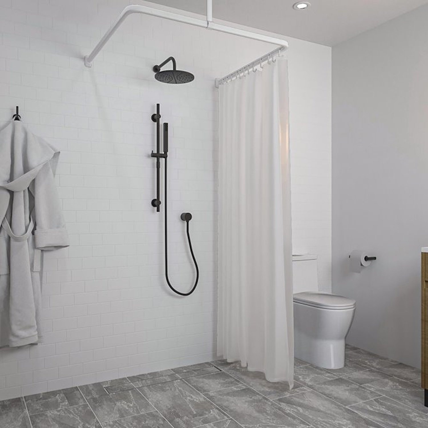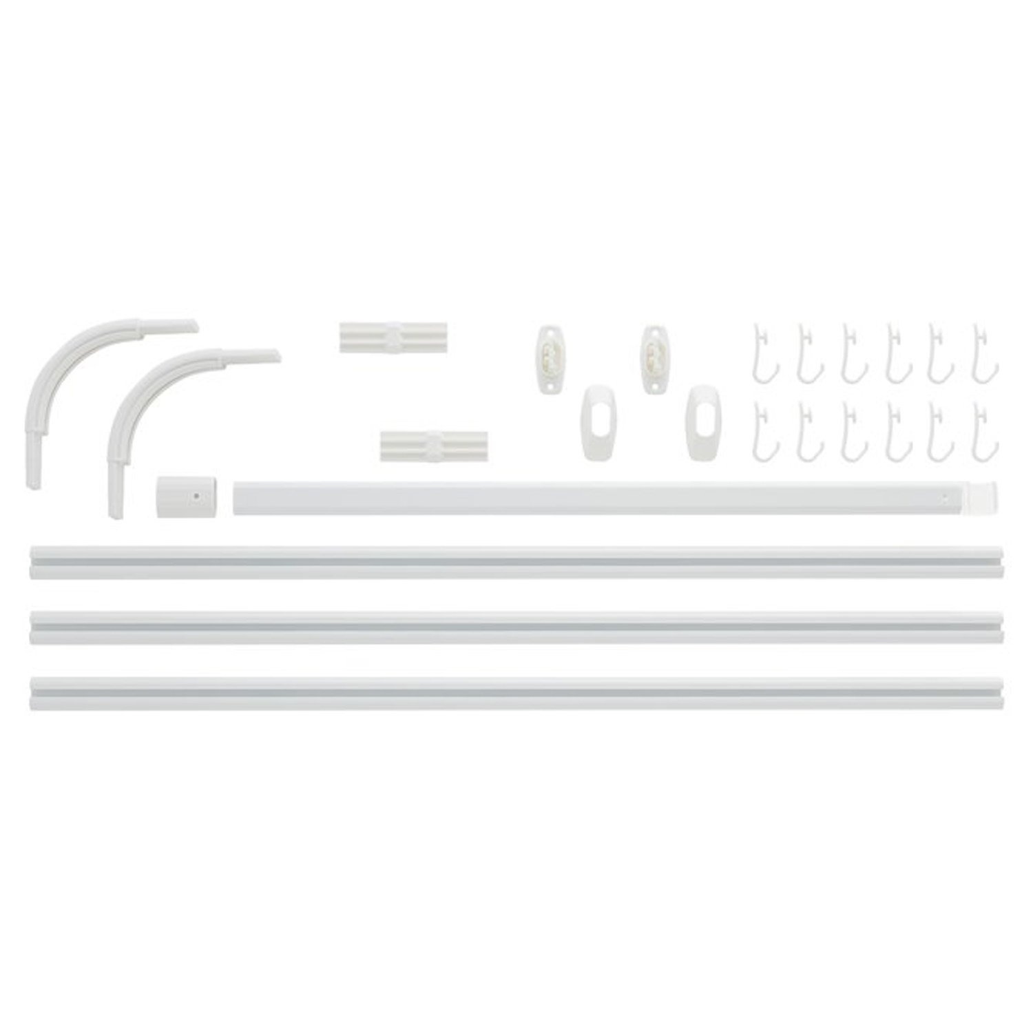 Deze set bevat 3 stangen van 90 cm, een plafondsteun van 60 cm, 2 koppelstukken en 12 gordijnhaken. De douchegordijnstangen zijn eenvoudig op maat te zagen. Het benodigde bevestigingsmateriaal en een handleiding is inbegrepen.
