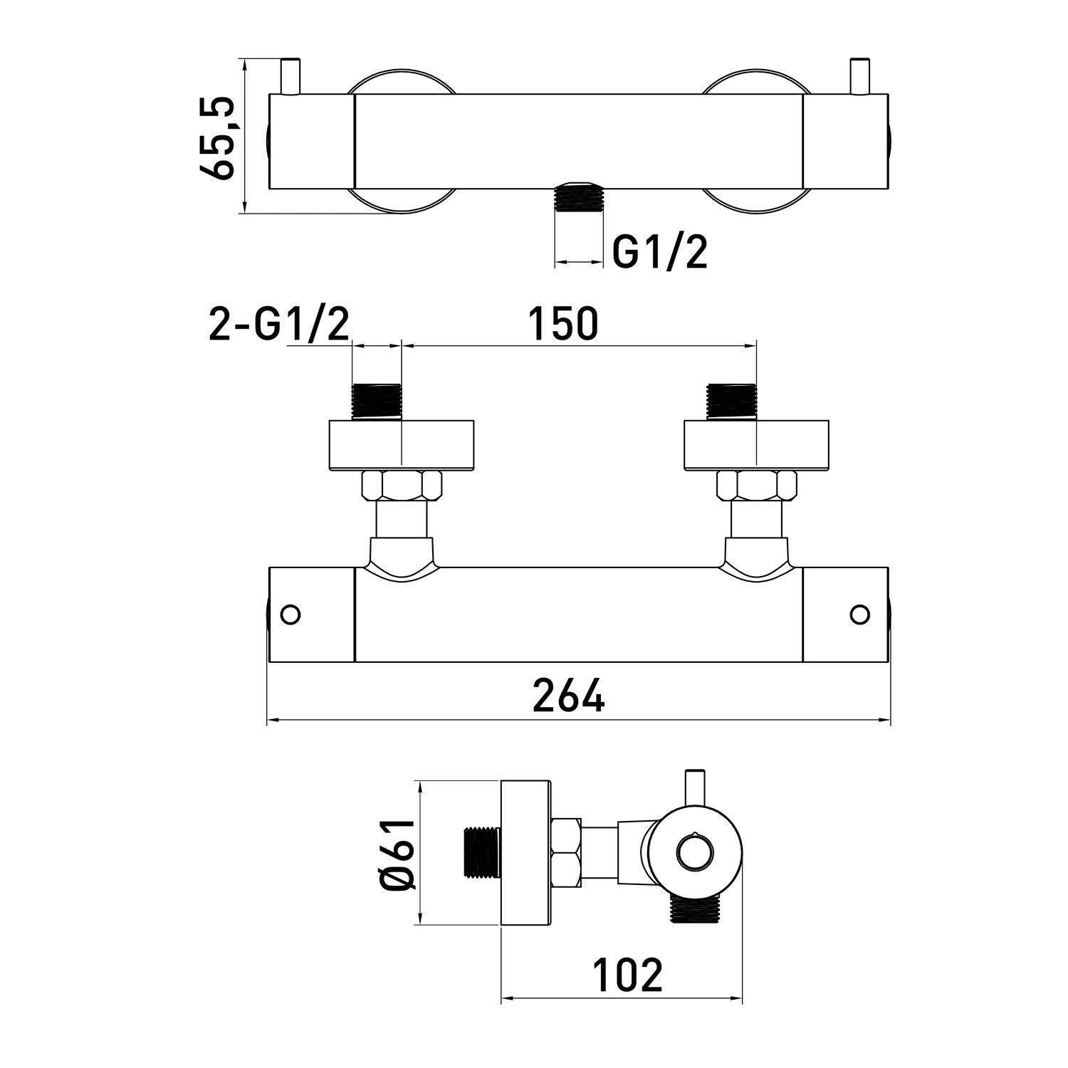 De douchekraan komt 10.2 cm van de muur af en de hart-op-hart maat is 15 cm. De kraan is in totaal 26.4 cm breed.