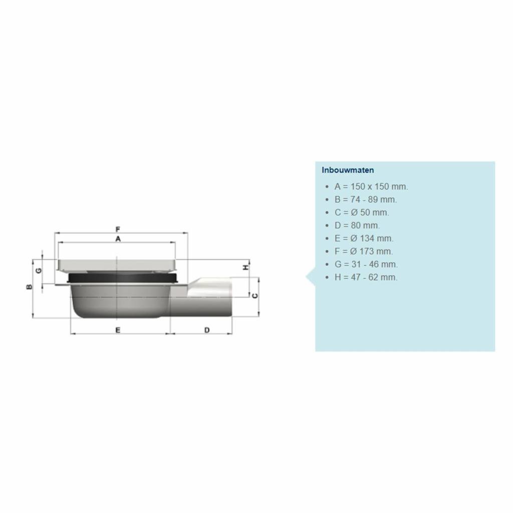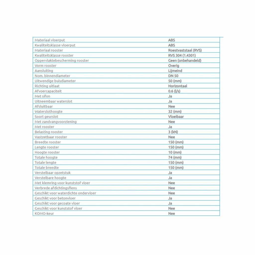 Aquaberg ABS vloerput m. RVS opzetstuk m. RVS rooster laag model m. zijuitl. Ø50mm 150x150mm m. PPC reukafsluiter, reukslot 32mm 4416