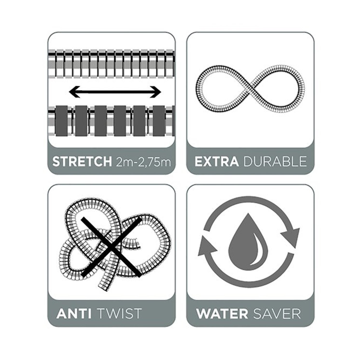 De doucheslang uit de Excellence collectie van Tiger geeft u meer beweegruimte dan ooit! Deze unieke doucheslang krult niet, knikt niet en beweegt daardoor makkelijk met elke beweging mee. De slang heeft een lengte van 200 cm maar is uitrekbaar tot 275 cm. Verder is de slangkoppeling voorzien van een rubberen ring wat zorgt voor meer stabiliteit en past de slang op elke handdouche en kraan. De doucheslang is bovendien extra duurzaam! U bespaart tot maar liefst 50% waterverbruik, zonder comfort te verliezen tijdens het douchen.