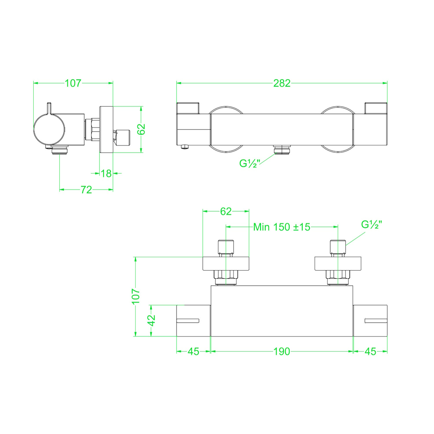 De douchethermostaatkraan heeft een breedte van 28,2 cm en een diepte van 10,7 cm. De kraan heeft hoogte van 6,2 cm en een HOH-maat van 15 cm - 16,5 cm. De maat van de draadaansluiting is 1/2 inch.