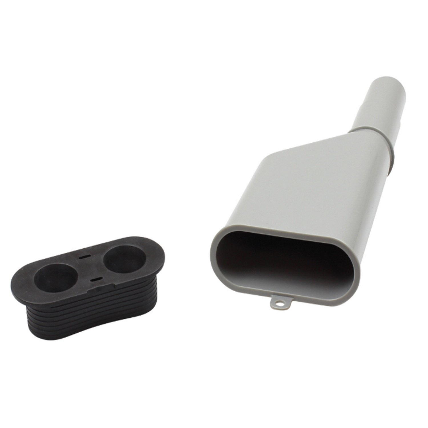 Deze nieuwe grijze duo afvoer voor wasmachine en droger is afkomstig van BWS. Het afsluitrubber in deze nieuwe afvoer zorgt ervoor dat nare rioolluchtjes tot het verleden behoren.