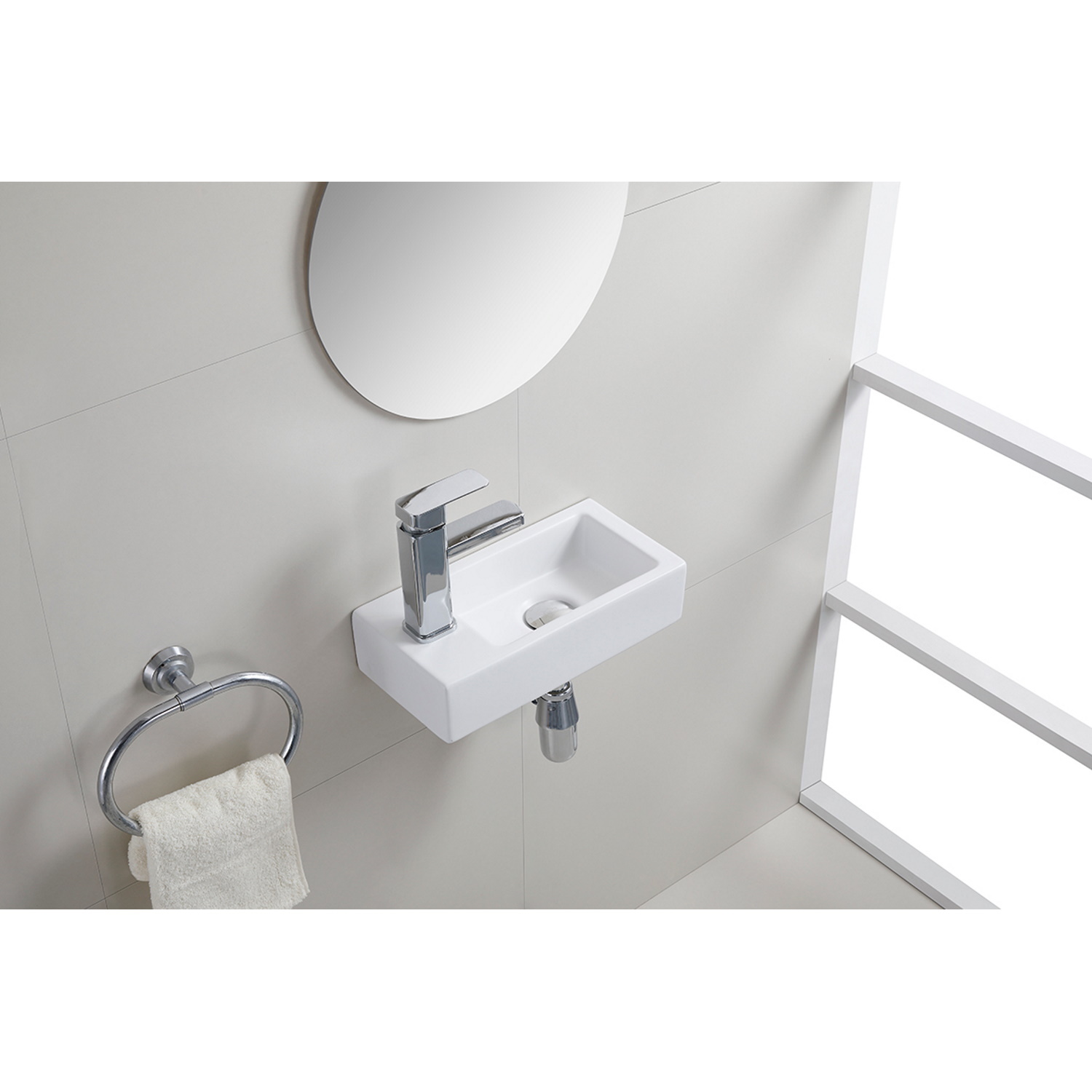 De fontein kent verder een mat witte kleur en heeft een rechthoekige vorm. Aan de linkerkant van het product bevindt zich een kraangat, waar u zelf een kraan op kunt monteren om de set compleet te maken.