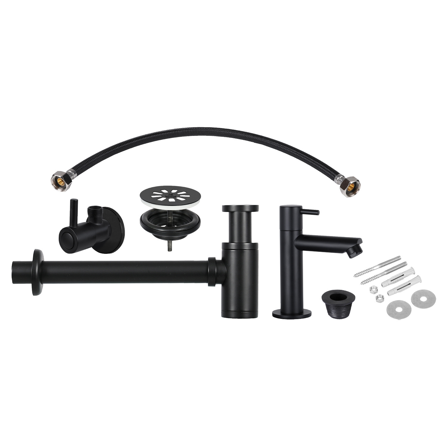 Met deze set installeer je een fontein bakje op je toilet of badkamer. Het is een complete set die alles bevat behalve het bakje zelf. De set is uitgevoerd in messing. Deze installatie set in de kleur mat zwart bestaat uit: hoekstopkraan 1/2 x 3/8 mat zwart, koudwaterkraan recht mat zwart, sifon manchet 32/40 zwart, sifon mat Zwart, afvoerplug mat Zwart, aansluitslang flexibel, bevestigingsset tbv fontein.