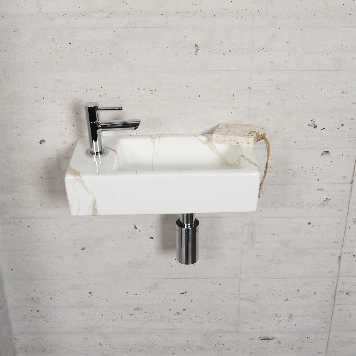 Fonteintjes zijn een belangrijk element in uw toiletruimte: de ruimte is vaak beperkt en het formaat van deze fontein biedt daarom uitkomst. Met een breedte van 36,5 cm, een diepte van 18 cm en een hoogte van 9 cm past deze fontein van het merk Wiesbaden perfect in iedere toiletruimte. Het fonteinbakje is gemaakt van keramiek maar door de unieke ader vorming die er in is gekleurd lijkt het net op Marmer. De marmerlook wat een zeer luxe uitstraling aan uw toiletruimte geeft, met de kenmerken en het gebruiksgemak van keramiek.