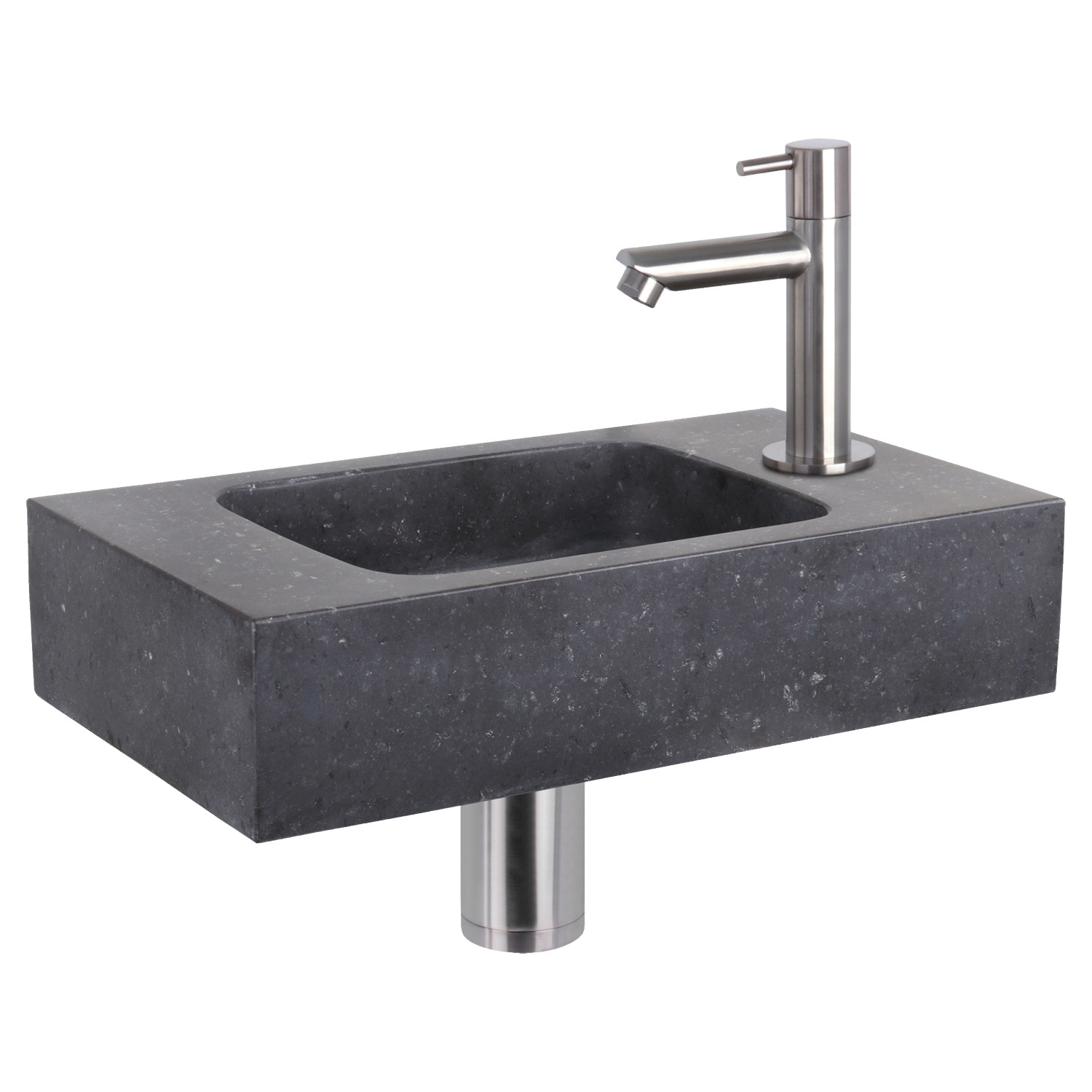 Deze combinatie bestaat uit het strak afgewerkte bombai black fontein natuursteen met mat chromen rechte koudwaterkraan, afvoerplug en sifon. Het kraangat zit aan de rechterkant van deze fontein. Het natuursteen is een natuurlijk materiaal wat een zeer luxe uitstraling.
