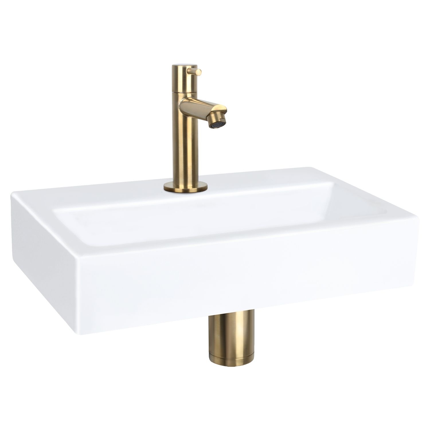 De Koudwaterkraan is afgewerkt in de mat gouden kleur. Natuurlijk wordt deze kleur ook afgewerkt bij de afvoerplug en sifon. Deze kraan heeft een hoogte van 13.4 cm en uitloop lengte van 8.2 cm. De kraan neemt niet te veel plek in. maar u heeft nog genoeg ruimte om uw handen te wassen.