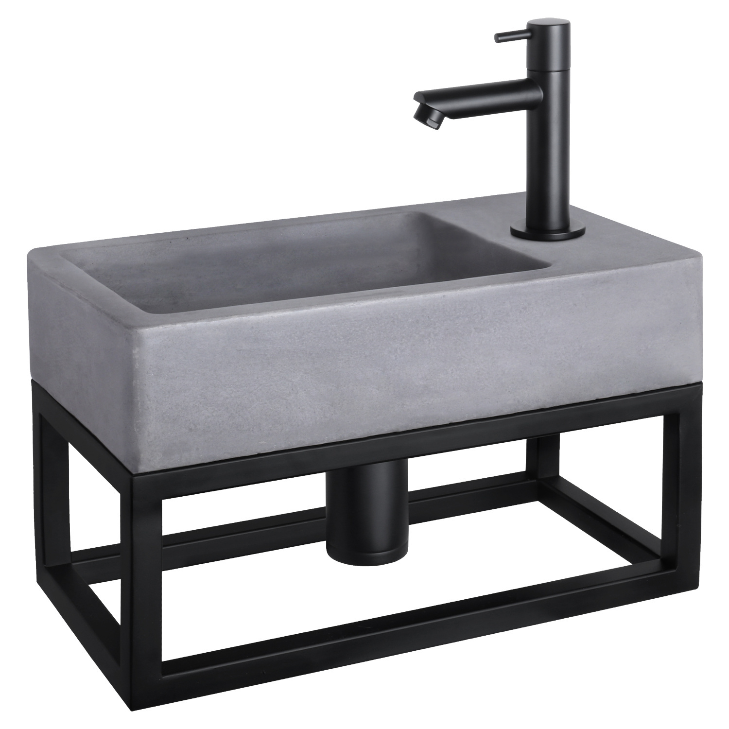 Deze combinatie bestaat uit het stijlvolle donker Betonnen fontein Force met mat Zwarte rechte koudwaterkraan, afvoerplug en sifon. Het handige bijpassende mat zwarte handdoekrek, waar u bijvoorbeeld uw handdoeken of andere toiletbenodigdheden kunt plaatsen of hangen, maakt de set helemaal af. Het kraangat zit aan de rechterkant van dit stijlvolle fontein. Het Betonnen materiaal is zeer stevig en heeft een waterdichte coating. Beton zorgt voor een industriële uitstraling .
