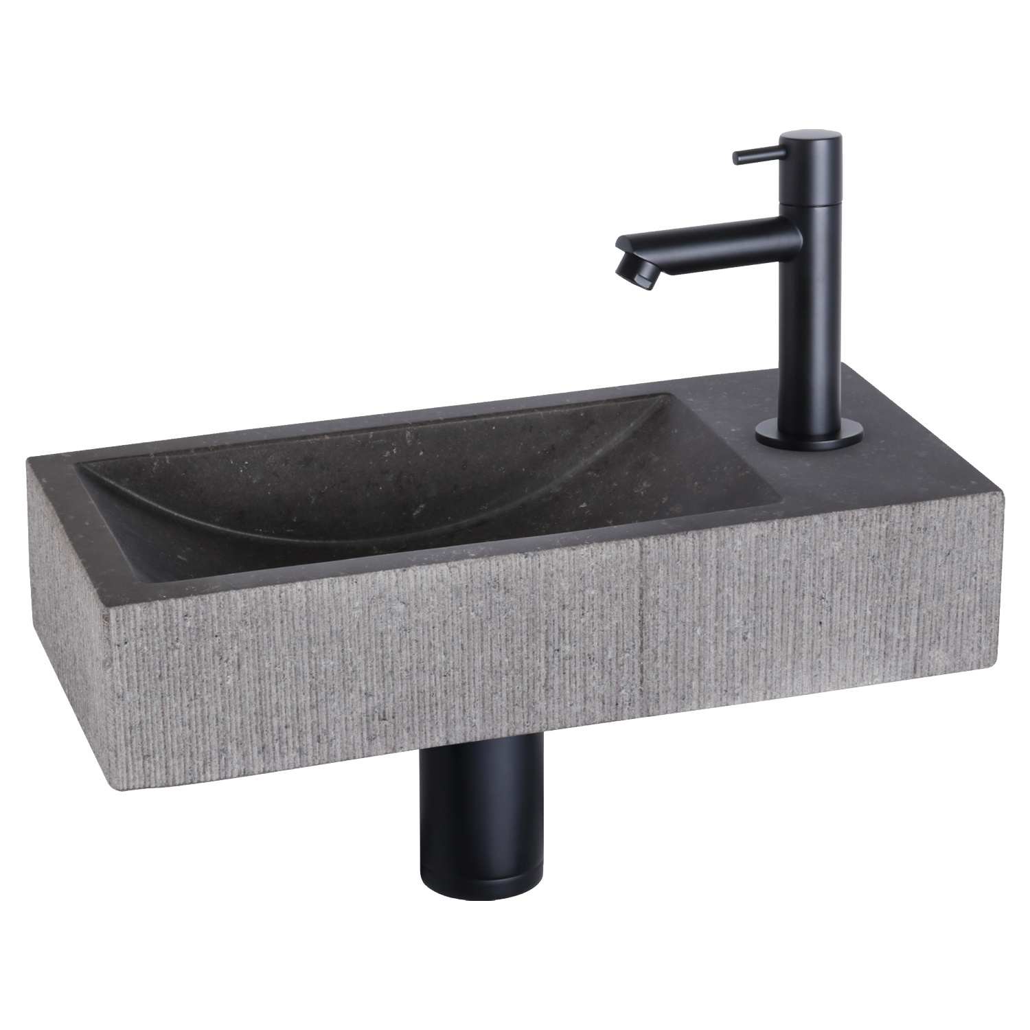 Deze set bestaat uit het strak vormgegeven fontein Ribble van hoogwaardig natuursteen met mat zwarte rechte koudwaterkraan, afvoerplug en sifon. Het kraangat zit aan de rechterkant van dit subtiele fontein. Het van hoogwaardig natuursteen is een natuurlijk materiaal wat een zeer luxe uitstraling aan uw toiletruimte geeft.
