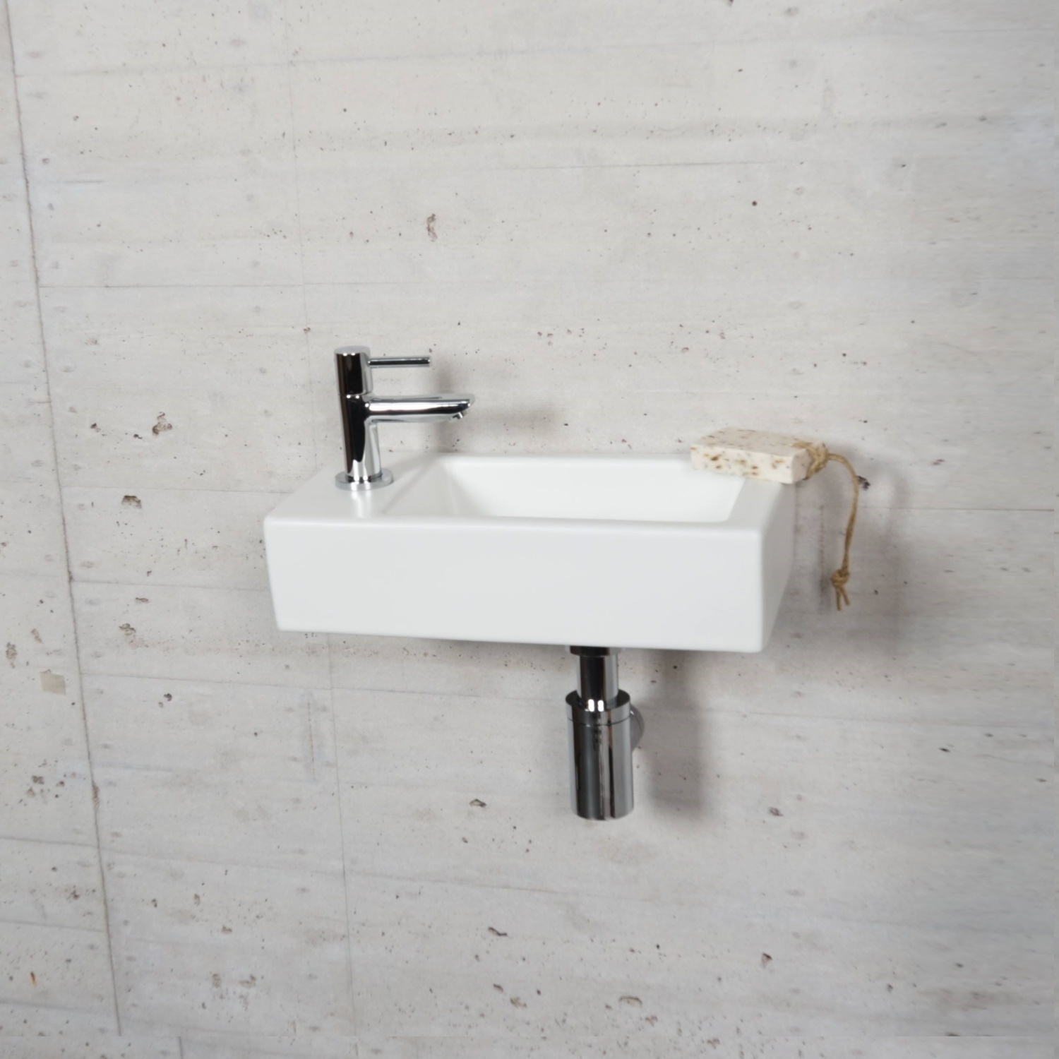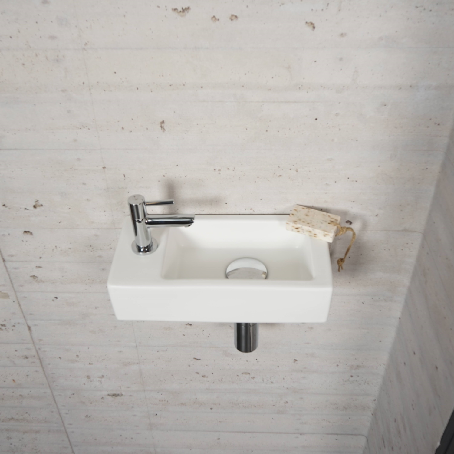 De fontein kent verder een mat witte kleur en heeft een rechthoekige vorm. Aan de linkerkant van het fonteintje bevindt zich het kraangat.