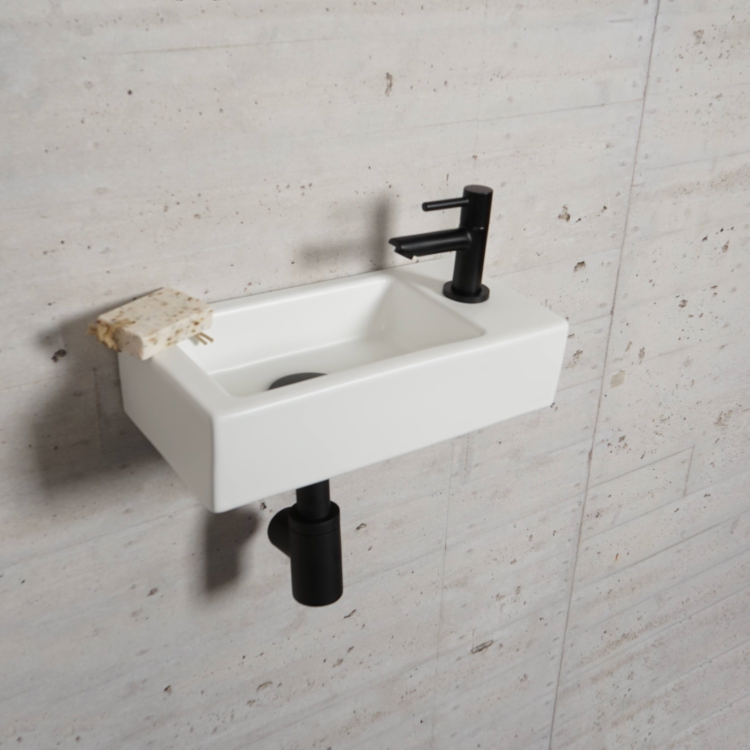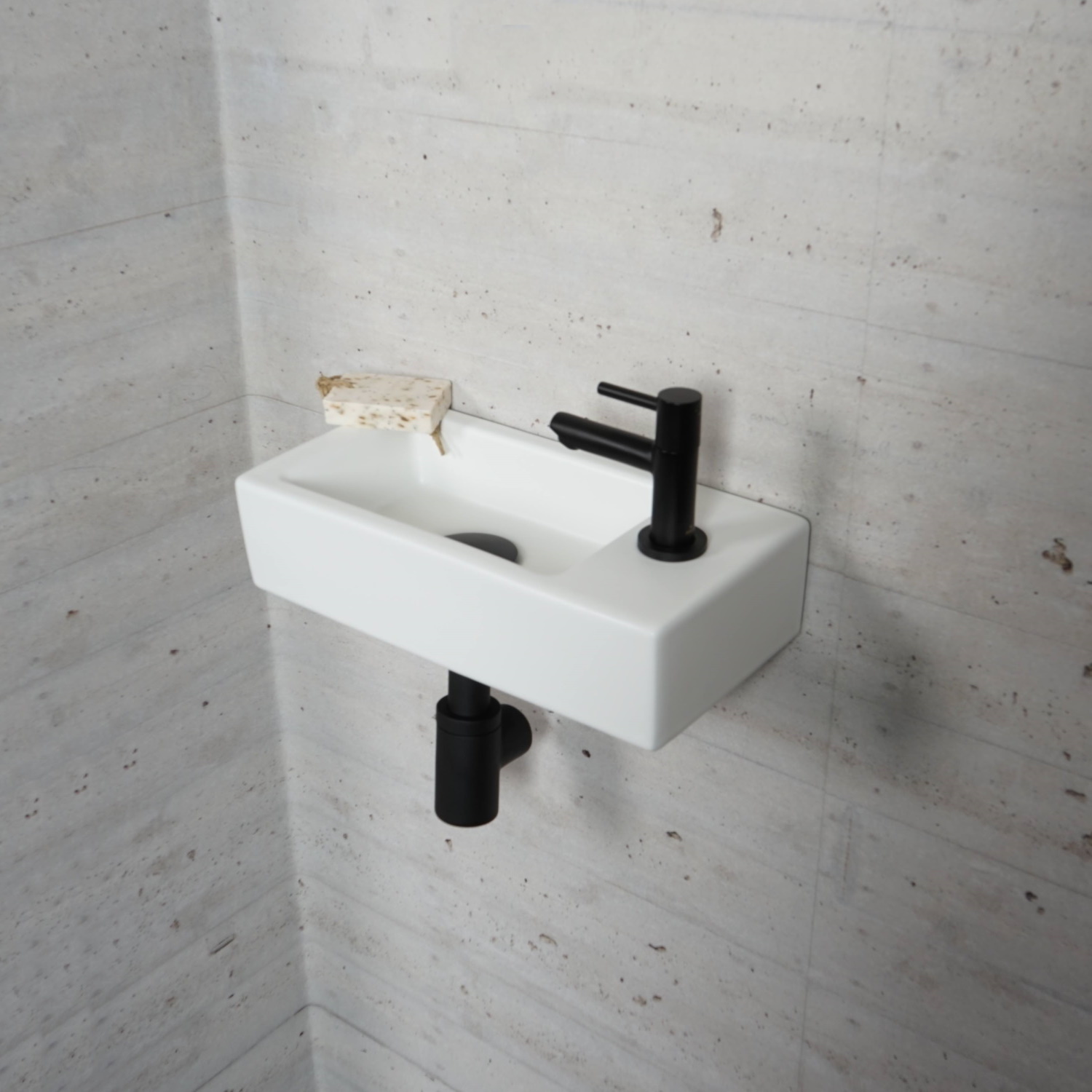 De fontein kent verder een mat witte kleur en heeft een rechthoekige vorm. Aan de rechterkant van het fonteintje bevindt zich het kraangat.