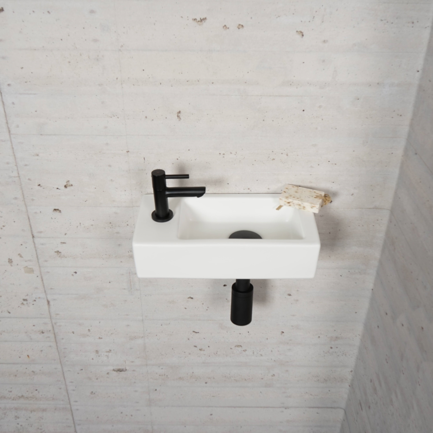 De fontein kent verder een mat witte kleur en heeft een rechthoekige vorm. Aan de linkerkant van het fonteintje bevindt zich het kraangat.