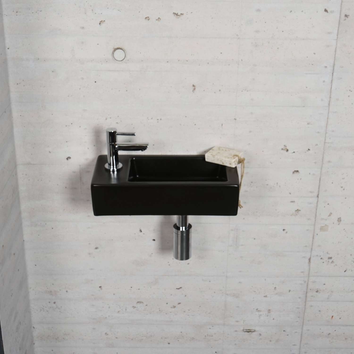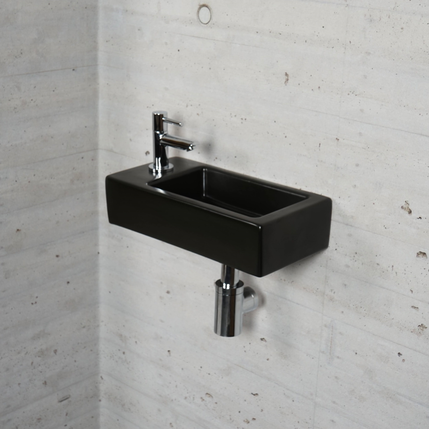 De fontein kent verder een mat zwarte kleur en heeft een rechthoekige vorm. Aan de linkerkant van het fonteintje bevindt zich het kraangat.
