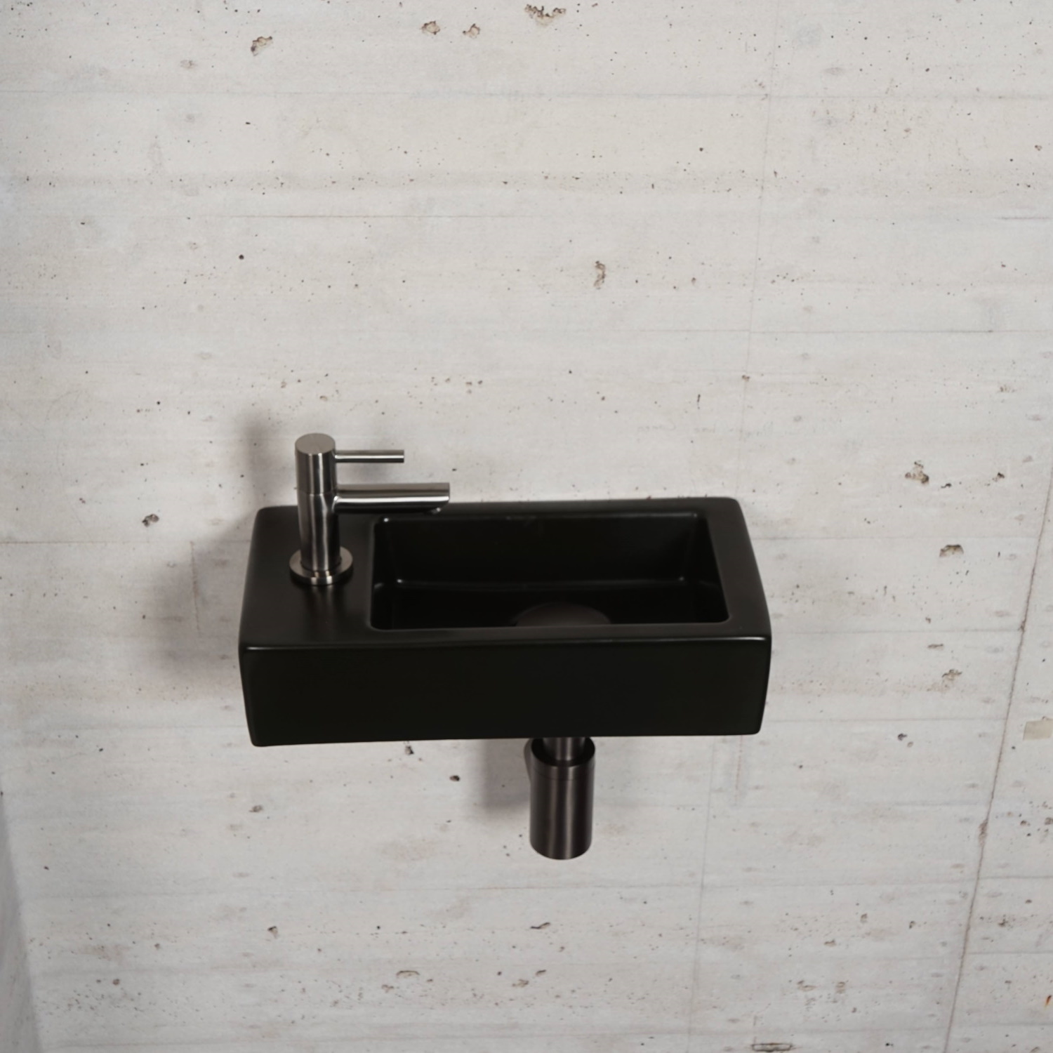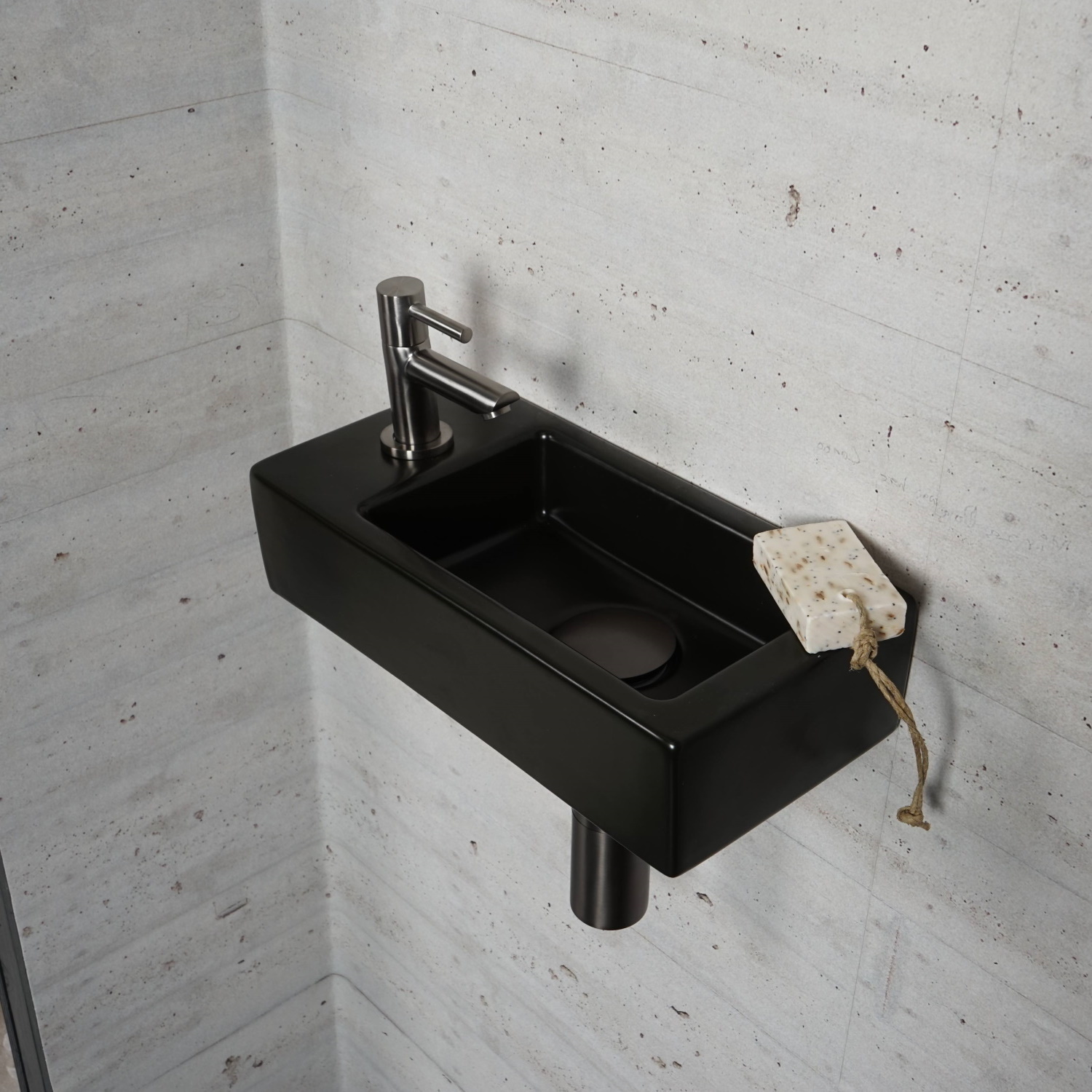 De fontein kent verder een mat zwarte kleur en heeft een rechthoekige vorm. Aan de linkerkant van het fonteintje bevindt zich het kraangat.