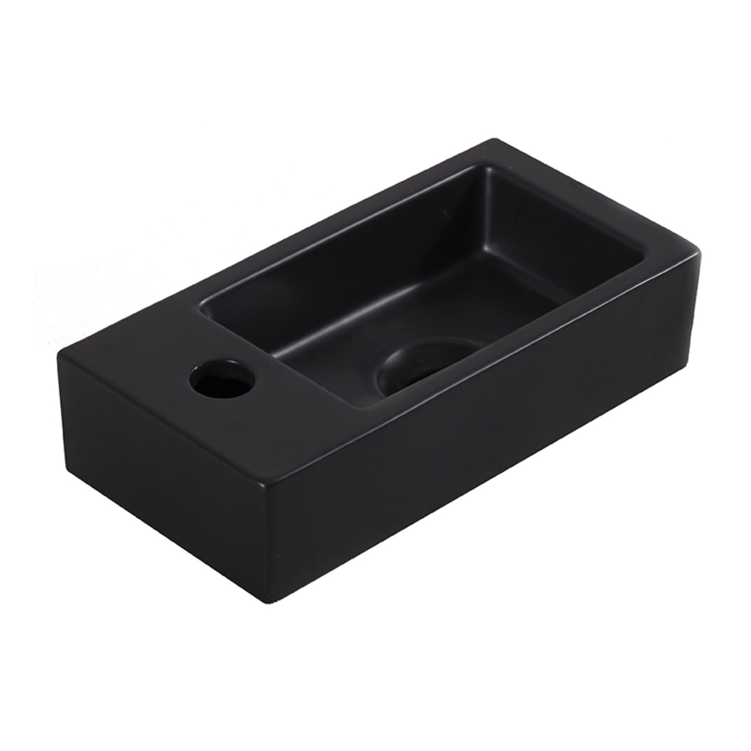 De fontein kent een rechthoekige vorm en een mat zwarte afwerking. Het kraangat bevindt zich aan de linkerkant van de fontein.
