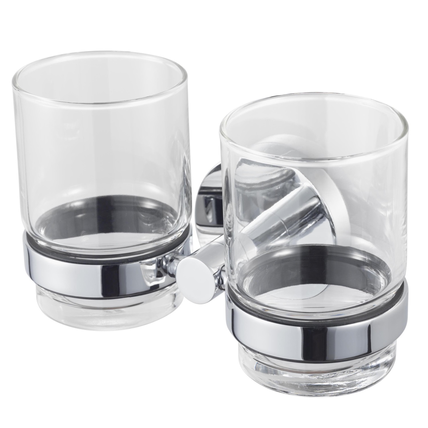 Strakke, solide bekerhouder met een beker gemaakt van helder glas. Door de zwarte rubberen ring wordt de beker stevig vastgeklemd. De houder monteert u snel en eenvoudig aan de wand.