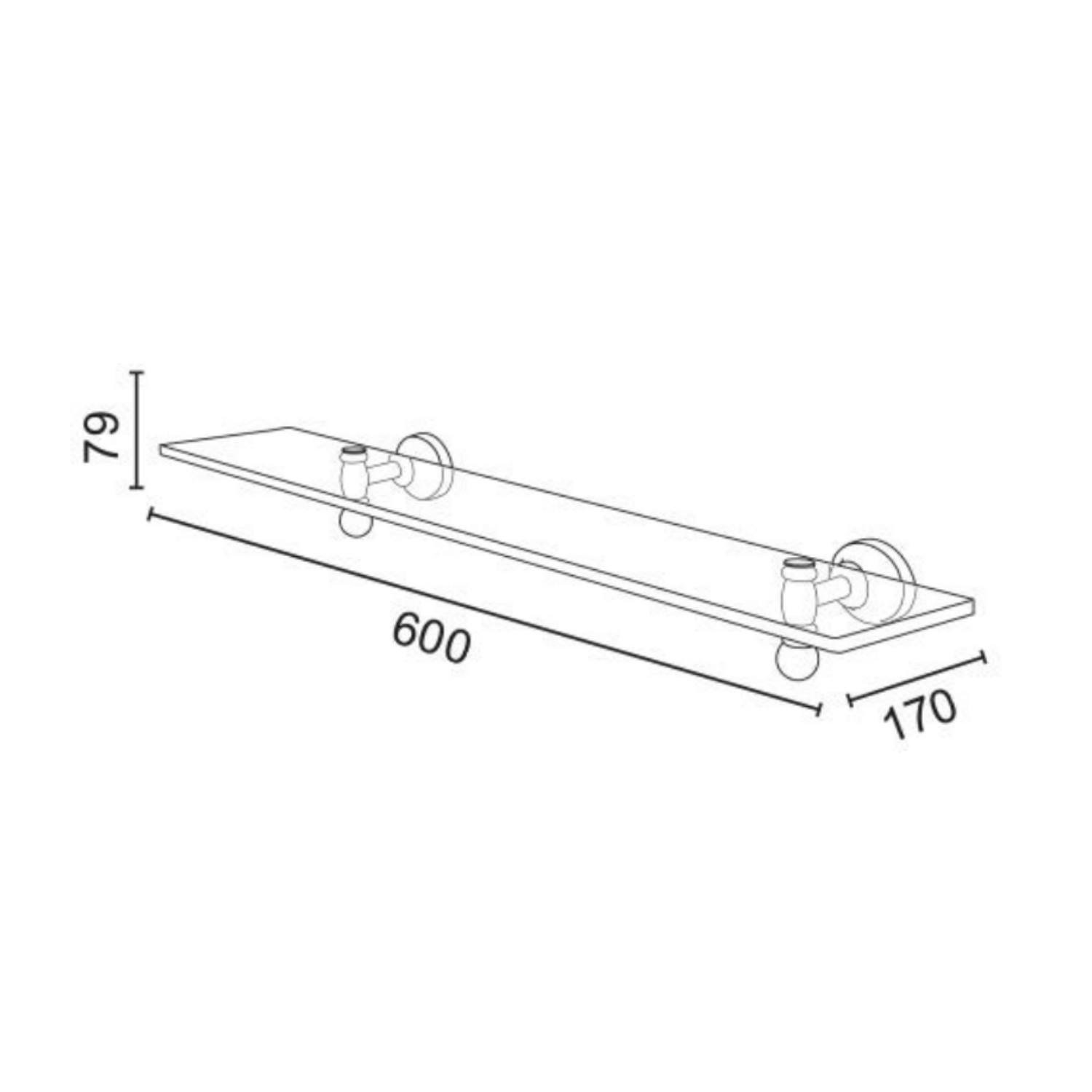 Het product heeft een afmeting van 60 x 7.9 x 17 cm (BxHxD) en is gemaakt van messing in de kleur rose goud met een plankje van helder glas.