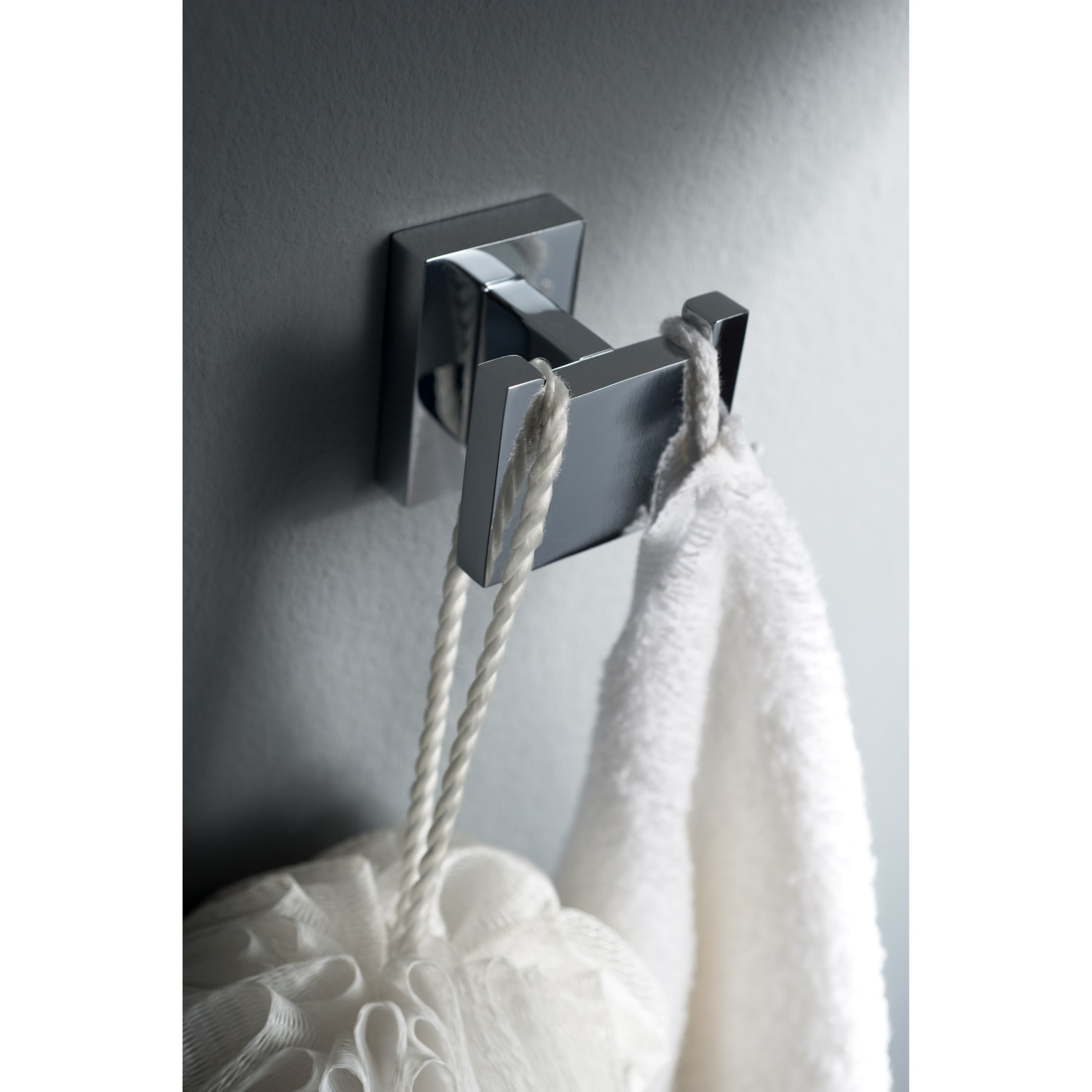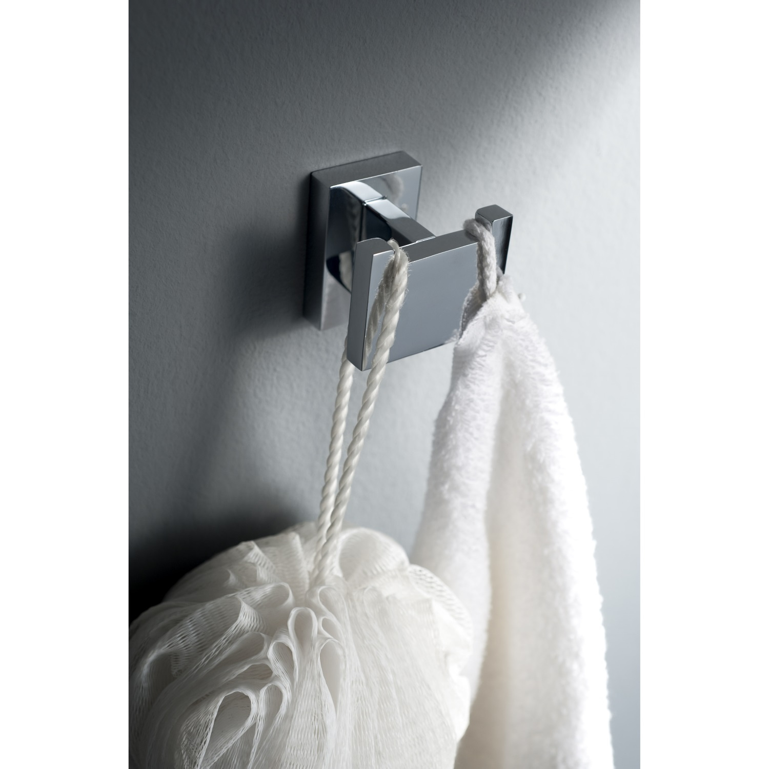 Het oermodel van de dubbele haak: met links en rechts een gekromd haakje. De lusjes van uw handdoeken blijven zo prima op hun plek.