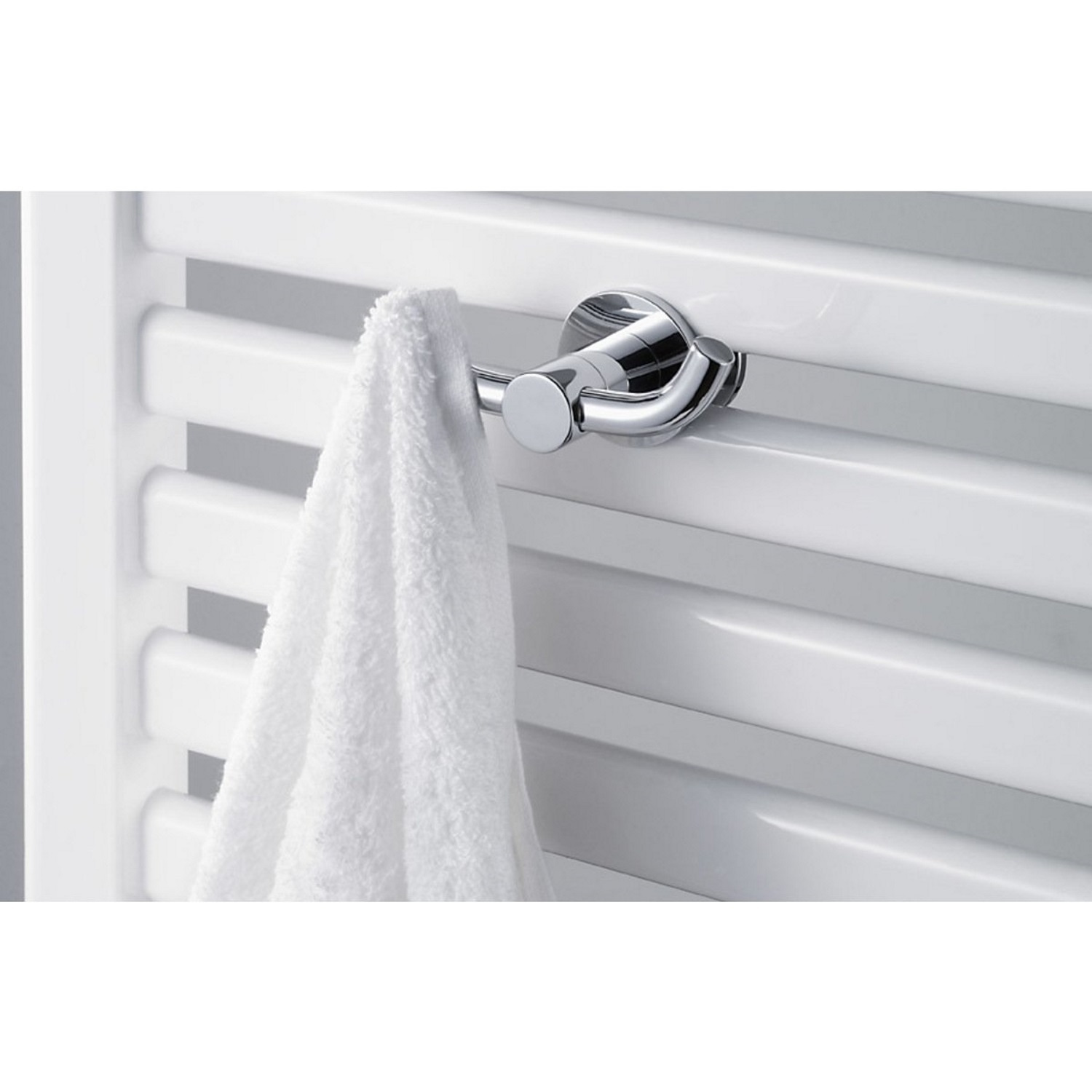 Deze Adoria Oase dubbele handdoekhaak is een speciale variant die bedoeld is om aan uw designradiator te bevestigen. De dubbele haak is voorzien van een universeel bevestigingssysteem waardoor deze op elke gewenste radiator van het merk Haceka te monteren valt. De handdoekhaak heeft een breedte van 7,3 cm, een hoogte van 3,9 cm en is gemaakt van roestvrij staal. Het artikel is afgewerkt in de kleur chroom.
