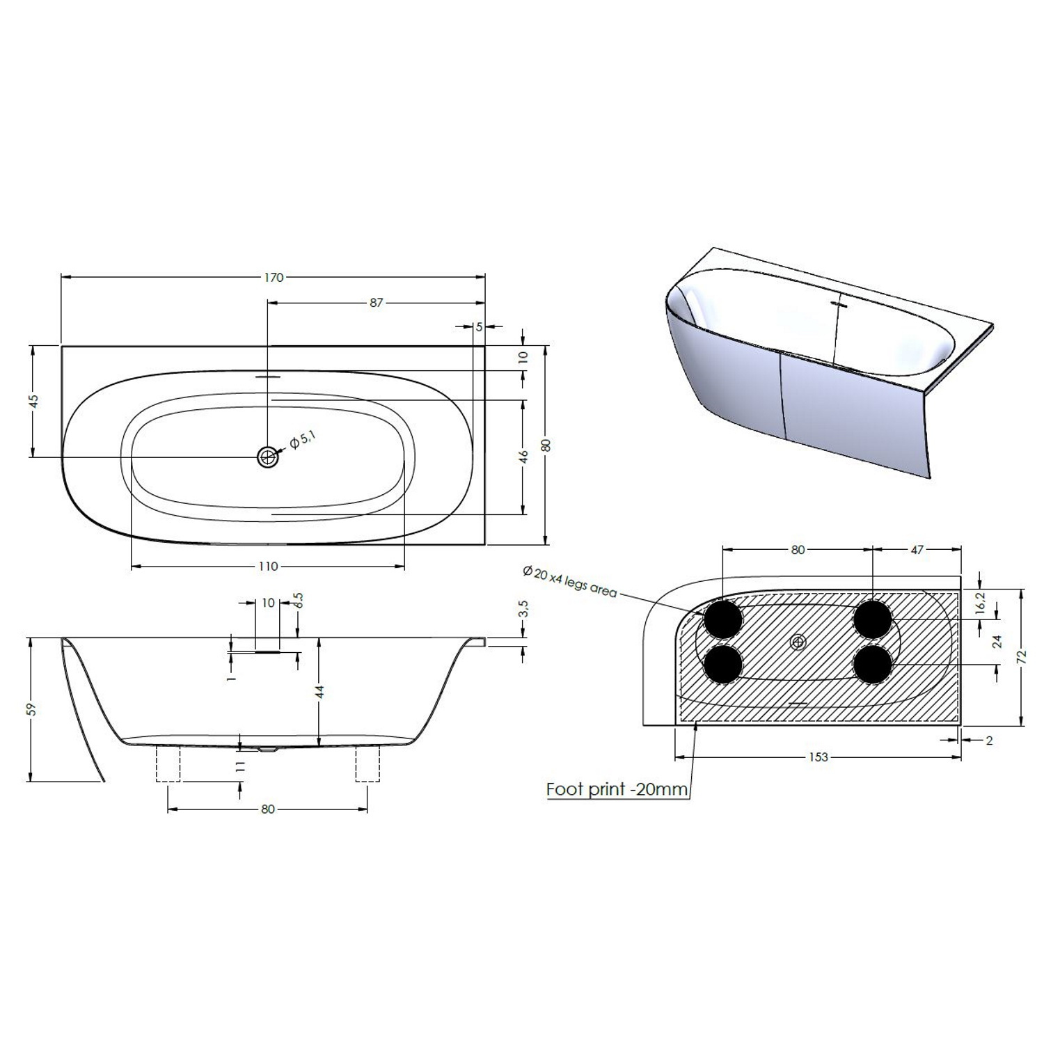 Het bad is voorzien van een overloop via een smalle sleuf. Het bad heeft een dunne en stijlvolle afwerking. Het bad past dan ook in iedere eigentijdse badkamer. Het bad wordt geleverd met stevige kunststof stelpoten en een chroom pop-up waste. Exclusief flexibele aansluitslang.