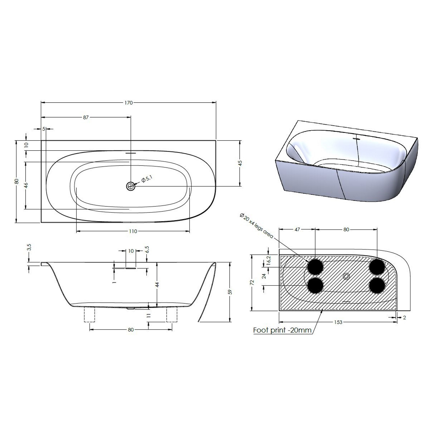 Het bad is voorzien van een overloop via een smalle sleuf. Het bad heeft een dunne en stijlvolle afwerking. Het bad past dan ook in iedere eigentijdse badkamer. Het bad wordt geleverd met stevige kunststof stelpoten en een chroom pop-up waste. Exclusief flexibele aansluitslang.