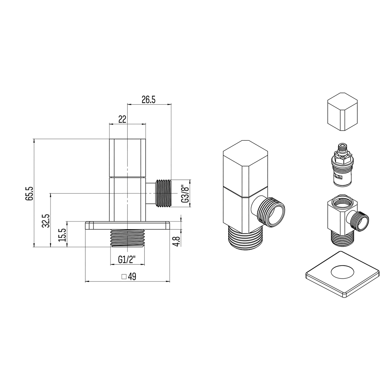 De kraan heeft een hoogte en breedte van 4,9 cm en een diepte van 6,5 cm.