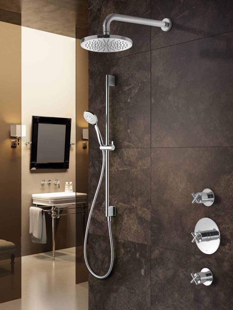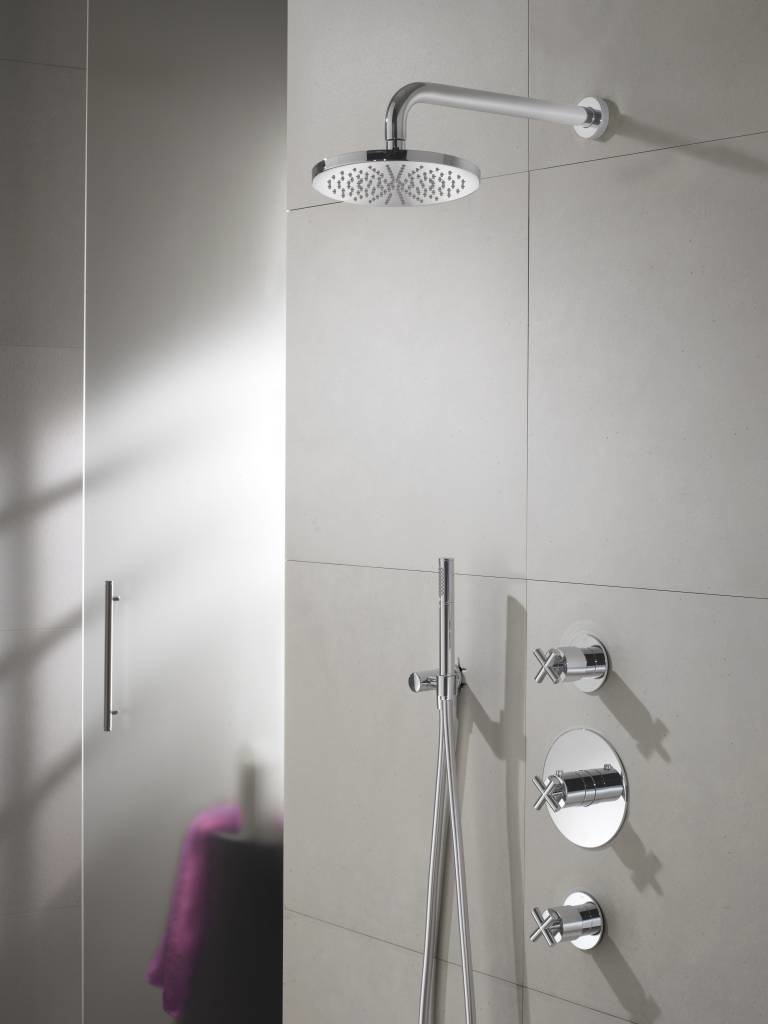 Chap thermostatische inbouw douche set met twee stopkranen. Deze set is vervaardigd uit messing en heeft een chroom of geborsteld nikkel afwerking. U heeft met deze set de mogelijkheid om hem zelf samen te stellen. Zo heeft u de keuze uit verschillende handdouches, hoofddouches en tevens keus uit verschillende bevestiging soorten voor de hand- en hoofddouche. Met de Hotbath regendouches zult u ook veel water gaan besparen, dit komt door het EcoAir en Shower Power System. Deze systemen zijn water besparend.