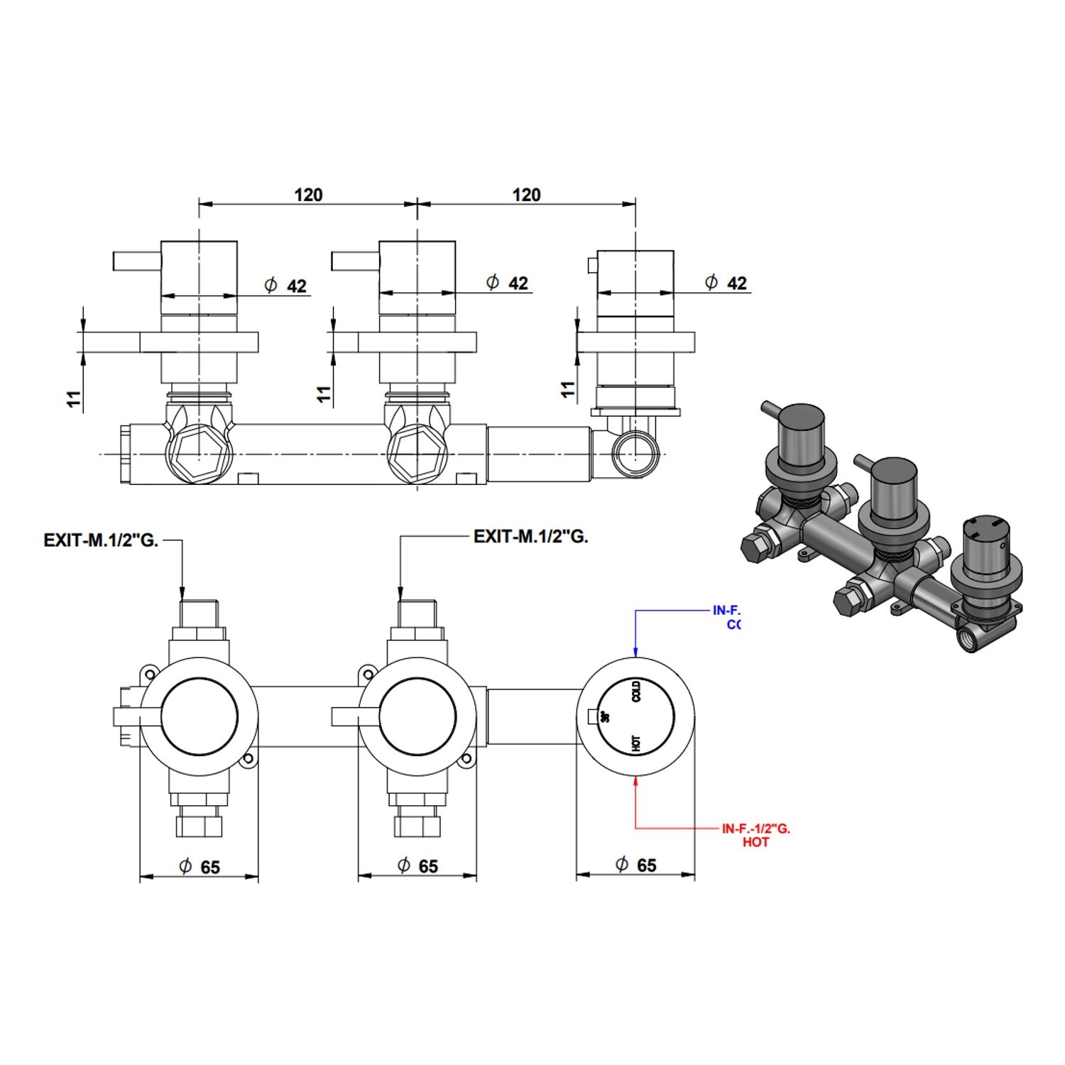 Houdt u van een rustige uitstraling in uw badkamer? Kies dan voor een inbouwkraan. Omdat de thermostaat in de muur zit, oogt het heel minimalistisch. De diameter van de knoppen is slechts 6,5 cm. Er zit 12 cm tussen de knoppen, gemeten vanaf het midden. Met de ene knop regelt u de temperatuur en met de andere knop draait u de kraan open en dicht.
