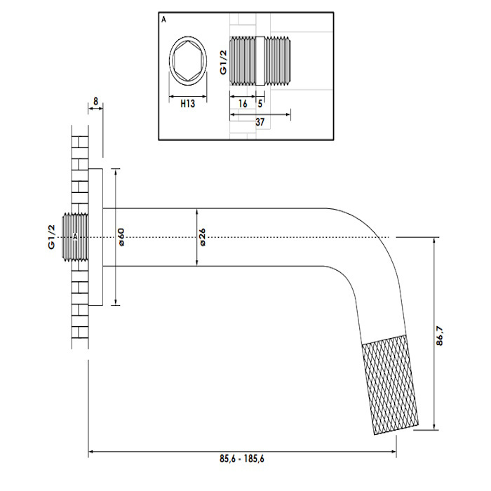 De fonteinkraan heeft een inkortbare uitloop van 8,5cm - 18,5cm en heeft een diameter van 2.6 cm. De aansluiting van de kraan is 1/2" en is gemaakt van messing. Messing heeft als kenmerk dat het goed bestand tegen vocht is. Hierdoor is dit artikel van een lange levensduur.