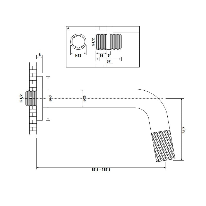 De fonteinkraan heeft een inkortbare uitloop van 8,5cm - 18,5cm en heeft een diameter van 2.6 cm. De aansluiting van de kraan is 1/2" en is gemaakt van messing. Messing heeft als kenmerk dat het goed bestand tegen vocht is. Hierdoor is dit artikel van een lange levensduur.