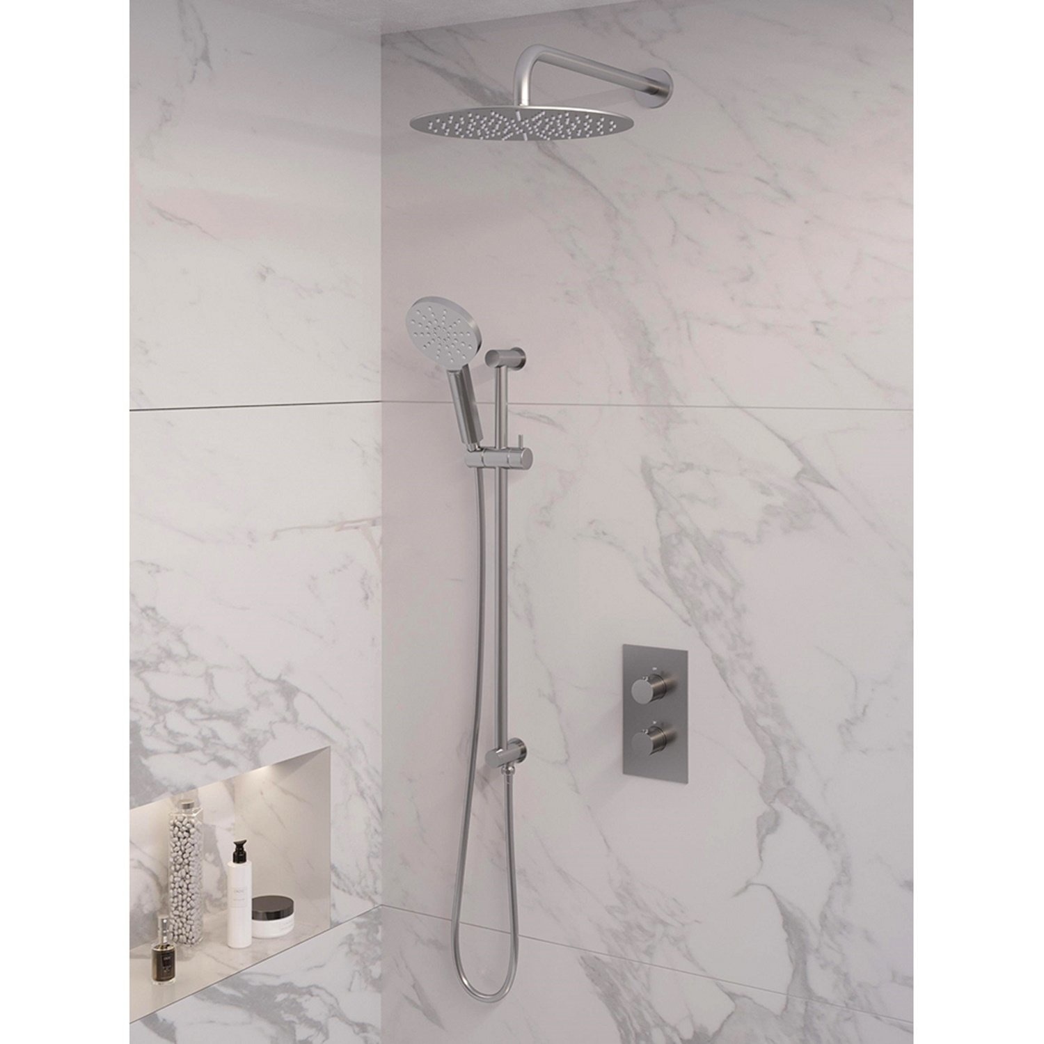 De set bestaat uit een inbouwthermostaat, een afbouw deel van de thermostaat kraan, een wandarm, een hoofddouche met een diameter van 30 cm, een handdouche inclusief wandarm en doucheslang. De thermostaatkraan, met 3/4'' aansluiting, is eenvoudig te bedienen door de twee knoppen. Met de onderste knop kunt u eenvoudig de temperatuur van het water instellen. De thermostaat beschikt over een kinderbeveiliging bij 38 graden, waardoor u nooit per ongeluk onder een kokend hete douche zat staan. met de bovenste knop bepaalt u de gewenste douchstand en kunt u switchen tussen de hoofd- en handdouche.