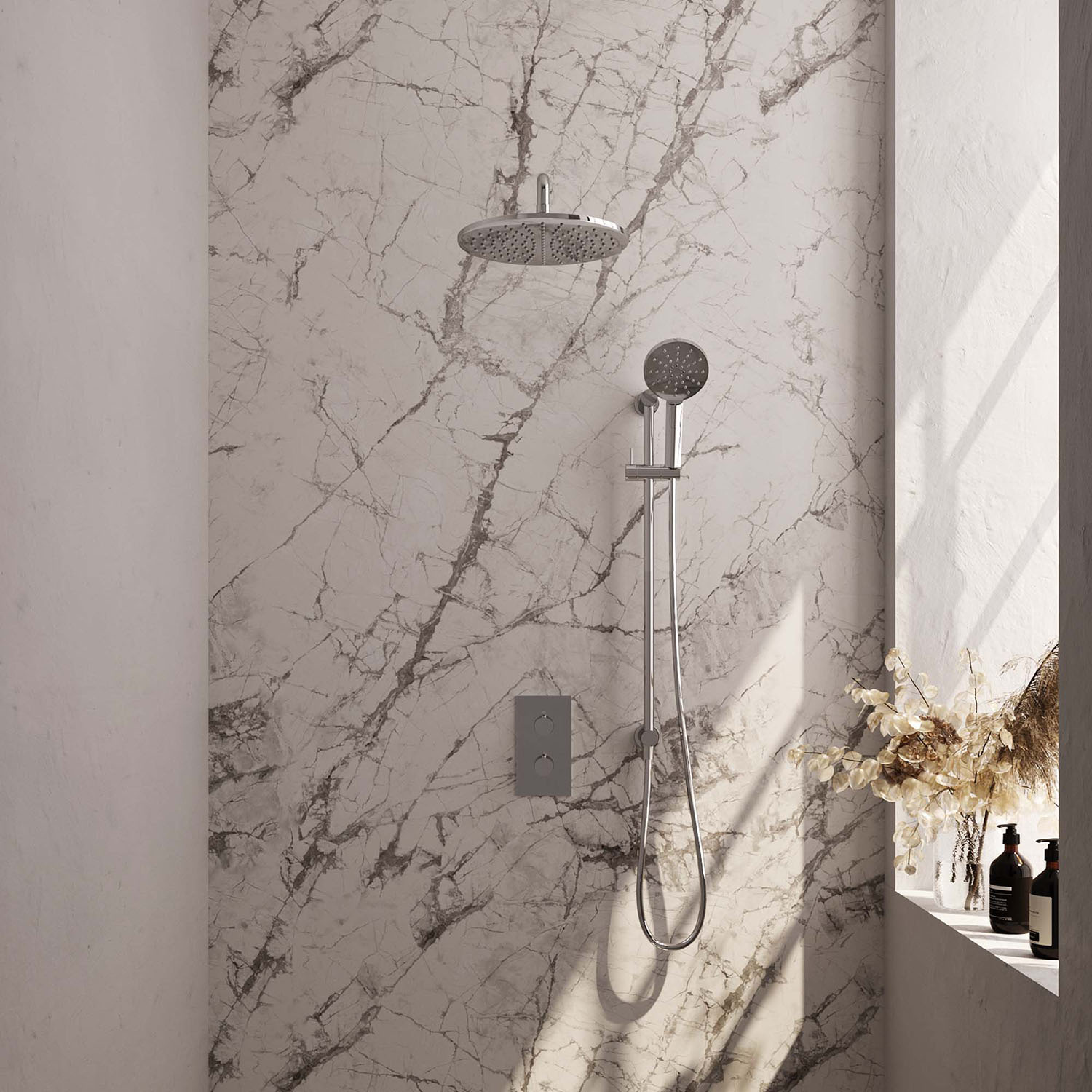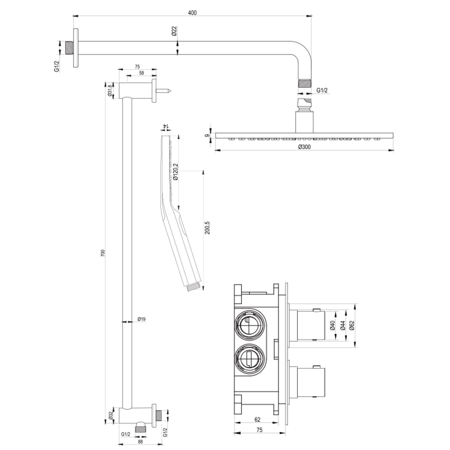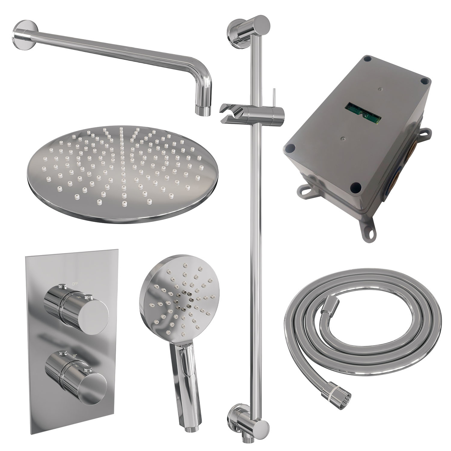 De set bestaat uit een inbouwthermostaat, een afbouw deel van de thermostaat kraan, een wandarm, een hoofddouche met een diameter van 30 cm, een handdouche inclusief glijstang en doucheslang. De thermostaatkraan, met 3/4'' aansluiting, is eenvoudig te bedienen door de twee knoppen. Met de onderste knop kunt u eenvoudig de temperatuur van het water instellen. De thermostaat beschikt over een kinderbeveiliging bij 38 graden, waardoor u nooit per ongeluk onder een kokend hete douche zat staan. met de bovenste knop bepaalt u de gewenste douchstand en kunt u switchen tussen de hoofd- en handdouche.