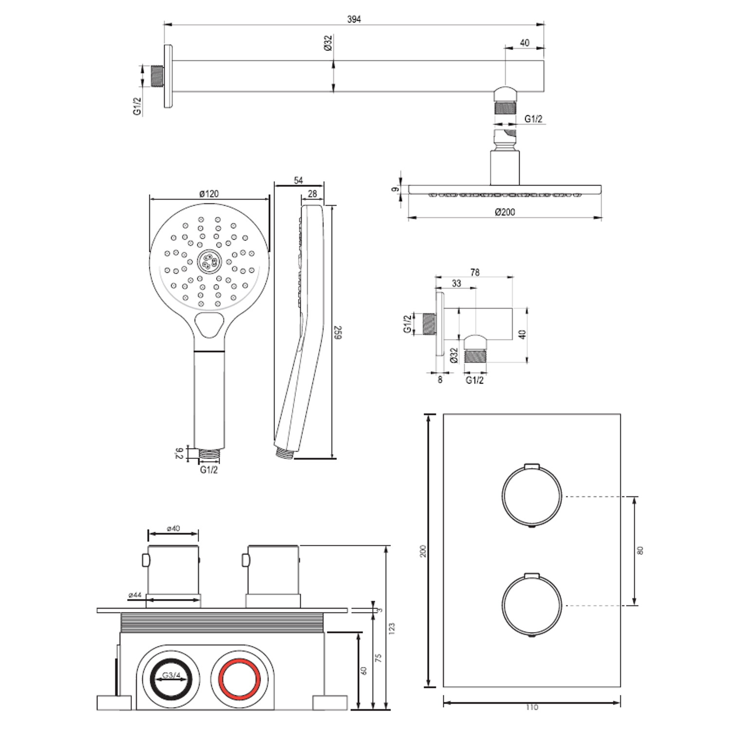 De set bestaat uit een inbouwthermostaat, een afbouw deel van de thermostaat kraan, een wandarm, een hoofddouche met een diameter van 20 cm, een handdouche inclusief wandarm en doucheslang. De thermostaatkraan, met 3/4'' aansluiting, is eenvoudig te bedienen door de twee knoppen. Met de onderste knop kunt u eenvoudig de temperatuur van het water instellen. De thermostaat beschikt over een kinderbeveiliging bij 38 graden, waardoor u nooit per ongeluk onder een kokend hete douche zat staan. met de bovenste knop bepaalt u de gewenste douchstand en kunt u switchen tussen de hoofd- en handdouche.