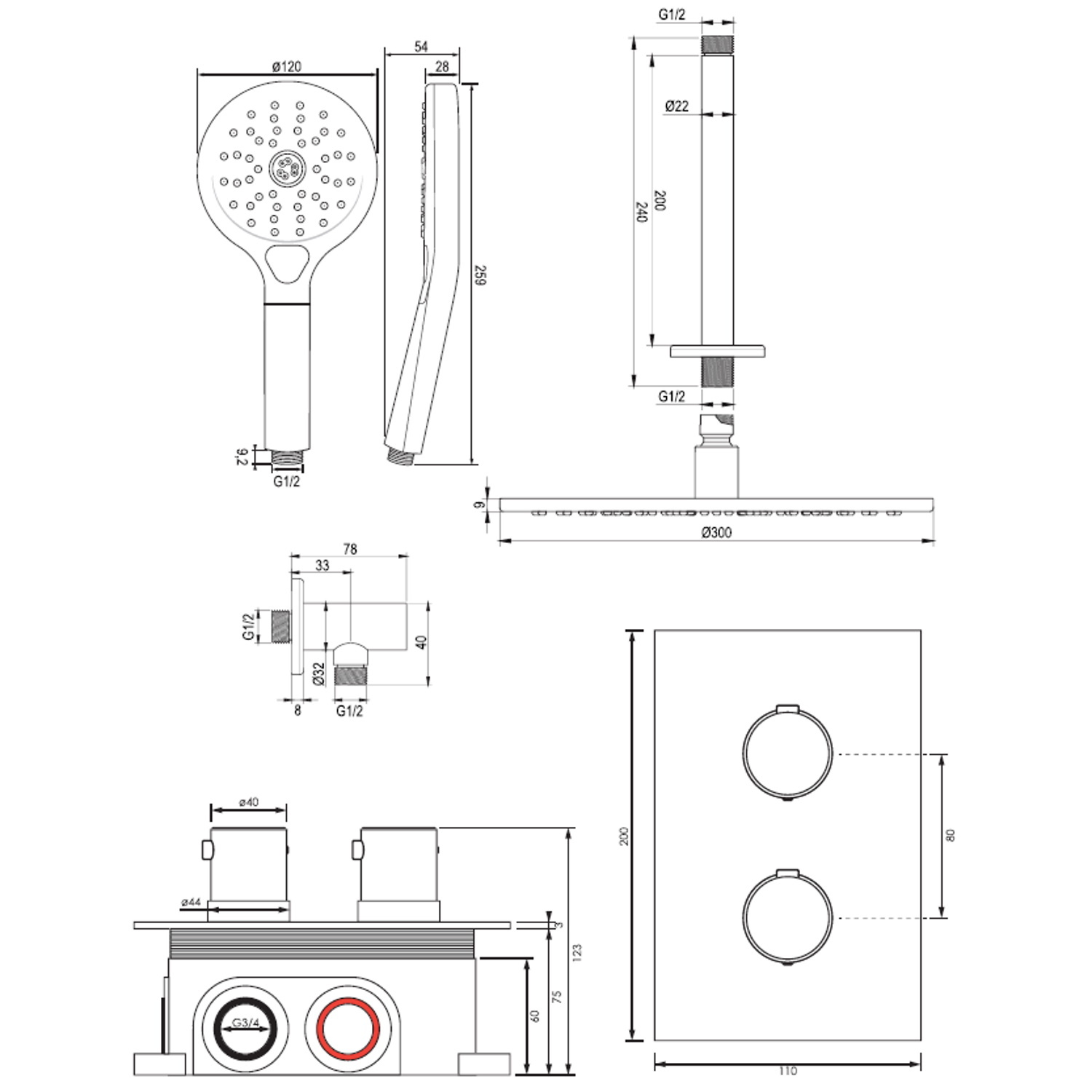 De set bestaat uit een inbouwthermostaat, een afbouw deel van de thermostaat kraan, een plafond uitloop, een hoofddouche met een diameter van 30 cm, een handdouche inclusief wandarm en doucheslang. De thermostaatkraan, met 3/4'' aansluiting, is eenvoudig te bedienen door de twee knoppen. Met de onderste knop kunt u eenvoudig de temperatuur van het water instellen. De thermostaat beschikt over een kinderbeveiliging bij 38 graden, waardoor u nooit per ongeluk onder een kokend hete douche zat staan. met de bovenste knop bepaalt u de gewenste douchstand en kunt u switchen tussen de hoofd- en handdouche.