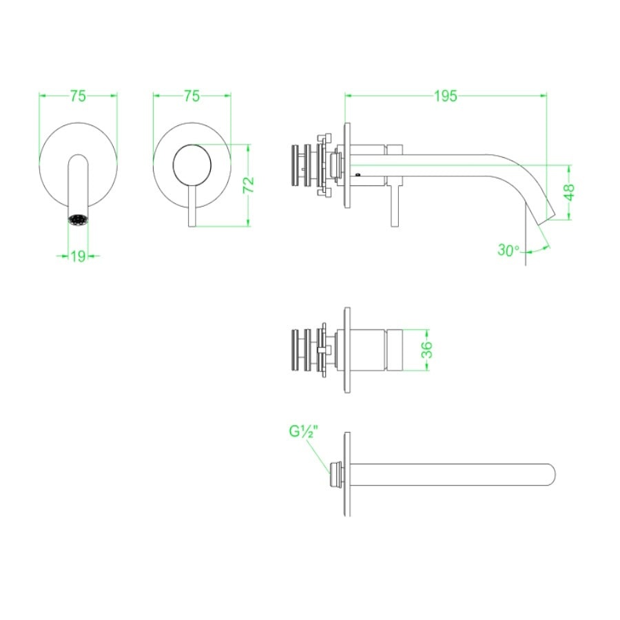 De wastafelkraan heeft een uitloop lengte van 19,5 cm en een uitloop hoogte van 4,8 cm. De kraan heeft een breedte van 7,5 cm en een diameter van 1,9 cm. De maat van de draadaansluiting is 1/2 inch.