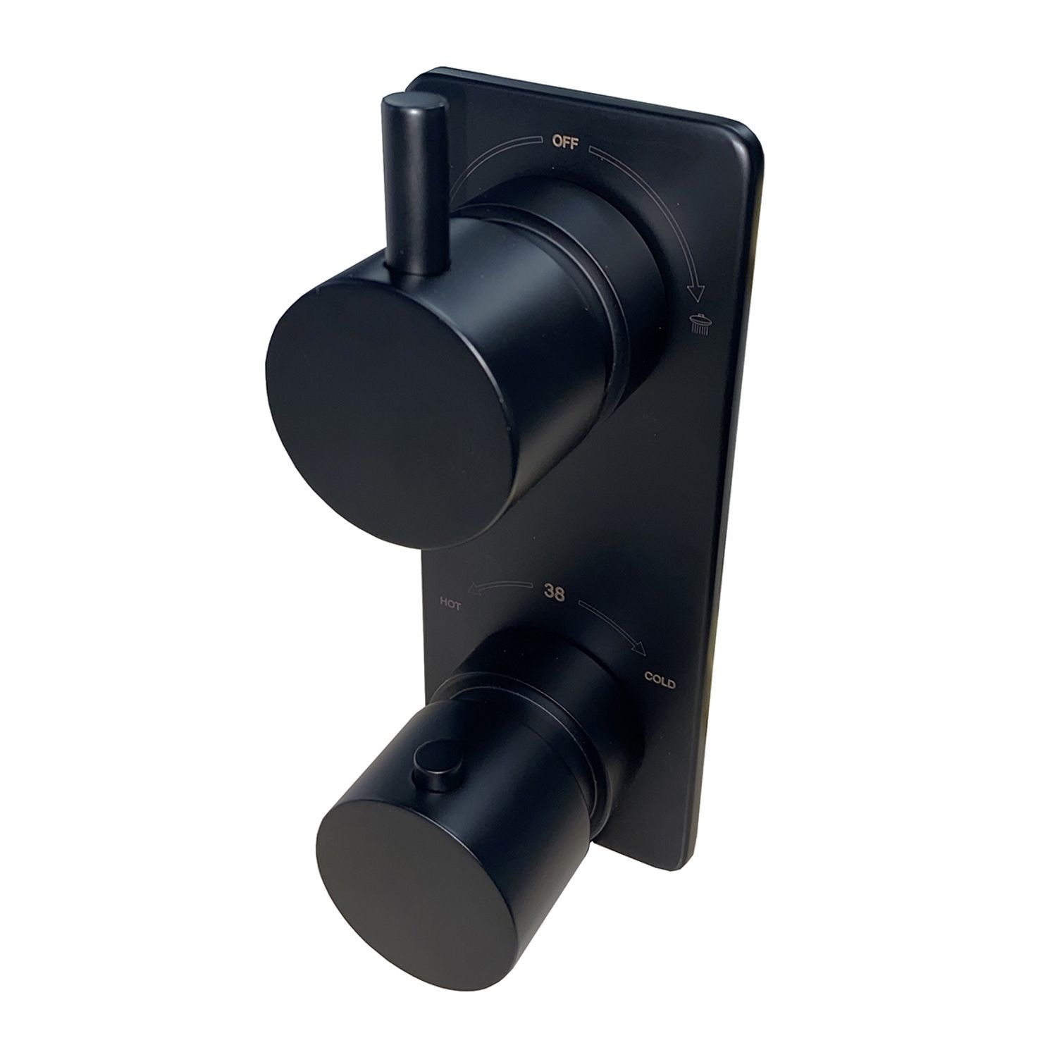 Deze mat zwarte thermostatische douchekraan is een eyecatcher in uw badkamer. Het design past perfect in vele interieurstijlen. De thermostaat is compleet met zowel een inbouwdeel als een afbouwdeel. De thermostaat bestaat uit 2 bedieningsknoppen. Met de bovenste knop wisselt u eenvoudig tussen de hoofddouche en de handdouche. De onderste knop is de thermostaatbediening en heeft een begrenzing op 38 graden celcius. Deze begrenzer maakt uw kraan extra gebruiksvriendelijk en voorkomt verbranding door te heet water bij bijvoorbeeld kinderen. Bovendien krijgt u direct water op de temperatuur die u heeft ingesteld en blijft de temperatuur constant.