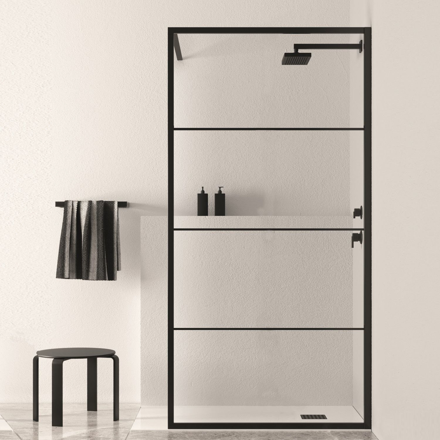 De inloopdouche beschikt over een heldere glasplaat en kent een glasdikte van 8 mm. De inloopdouche is voorzien van een mat-zwart raster en geeft daarmee een moderne en strakke uitstraling aan uw badkamer. De lijnen bevinden zich alleen op de buiten kant van het glas, zodat de binnen kant glad is. De inloopdouche is verkrijgbaar in de volgende maten: