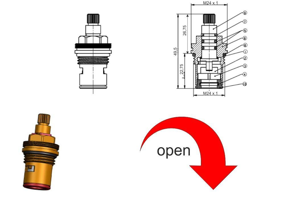 Keramische spindel 1/2" links sluitend rood, 1/4 slag open/dicht,