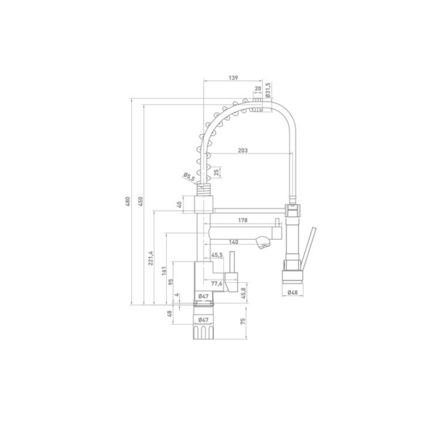 De keukenkraan heeft een hoogte van 48 cm, de lengte uitloop van de flexibele slang is 20.3 cm en de hoogte van de slang is 45 cm. De middelste hendel van de keukenkraan heeft een lengte uitloop van 17.8 cm en de hoogte uitloop is 16.1 cm. Het materiaal van de kraan is messing in de kleur chroom.