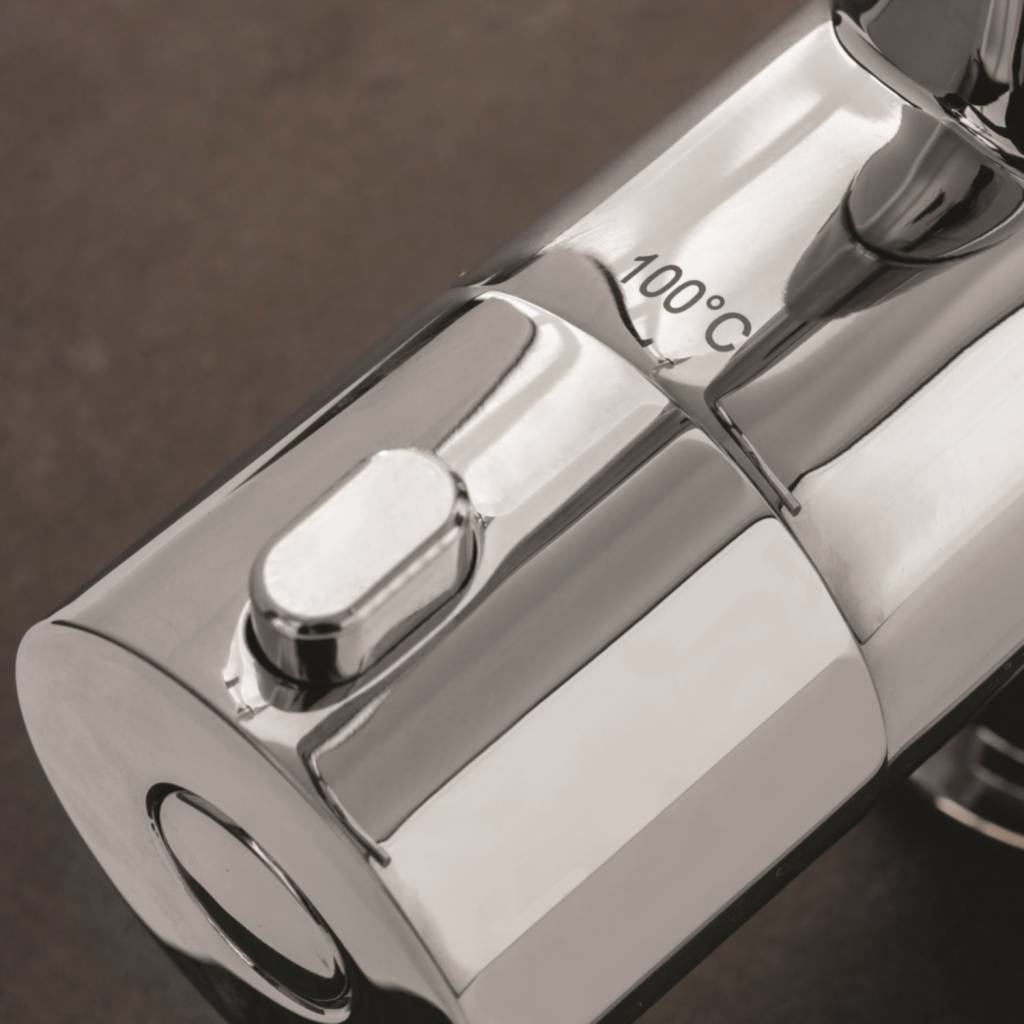 Met de linker knop kunt u met de druk-draaibediening kokend water tappen; de rechterhendel geeft koud en warm water. Het kraangat is net als bij de meeste andere kranen 35 mm. Deze kokend waterkraan is in twee modellen leverbaar: haaks en rond. De kraan is een Europees fabricaat, en is degelijk in het gebruik en mooi vormgegeven. De kraan is vervaardigd van messing en is in RVS afgewerkt.