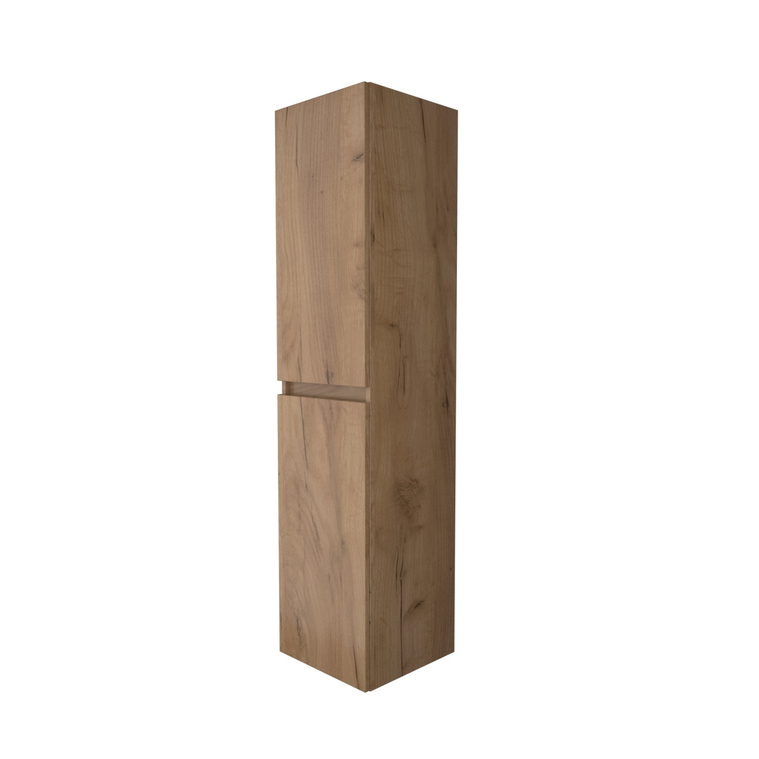 Deze mooie kolomkast uit de serie Salt is van het merk Aquasplash. De hoogte van deze kolomkast is 150 cm, de breedte is 35 cm en de diepte is 35 cm. De kolomkast is gemaakt van melamine in de kleur Whisky Oak. Deze kolomkast heeft een geïntegreerde greep waardoor deze niet op de kast geplaatst zit. De deur van de kolomkast is voorzien van softclose. De kolomkast is voorzien van 3 glazen legplaten waar u uw handdoeken en dergelijken op kunt plaatsen, in het midden van de kast zit een melamine bak die dient als legplaat.