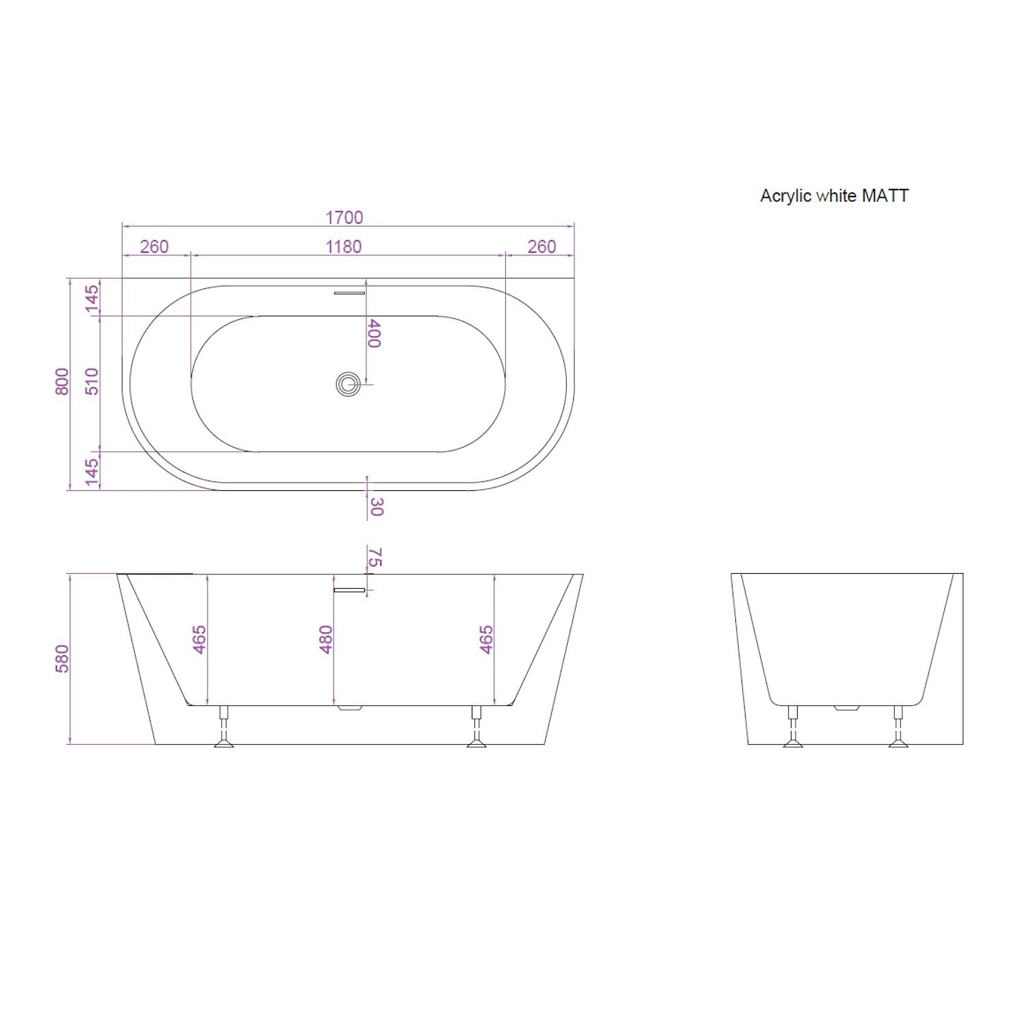 Het ligbad heeft een mat witte afwerking. Het bad is geschikt voor de installatie tegen de wand. Het bad heeft een lengte van 170 cm, een breedte van 80 cm en een totale hoogte van 58 cm.