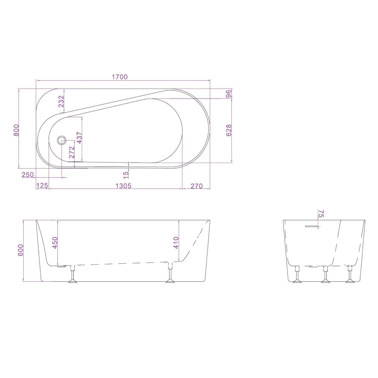 Het ligbad heeft een mat witte afwerking. Het bad is geschikt voor de installatie tegen de wand. Het bad heeft een lengte van 170 cm, een breedte van 80 cm en een totale hoogte van 58 cm.