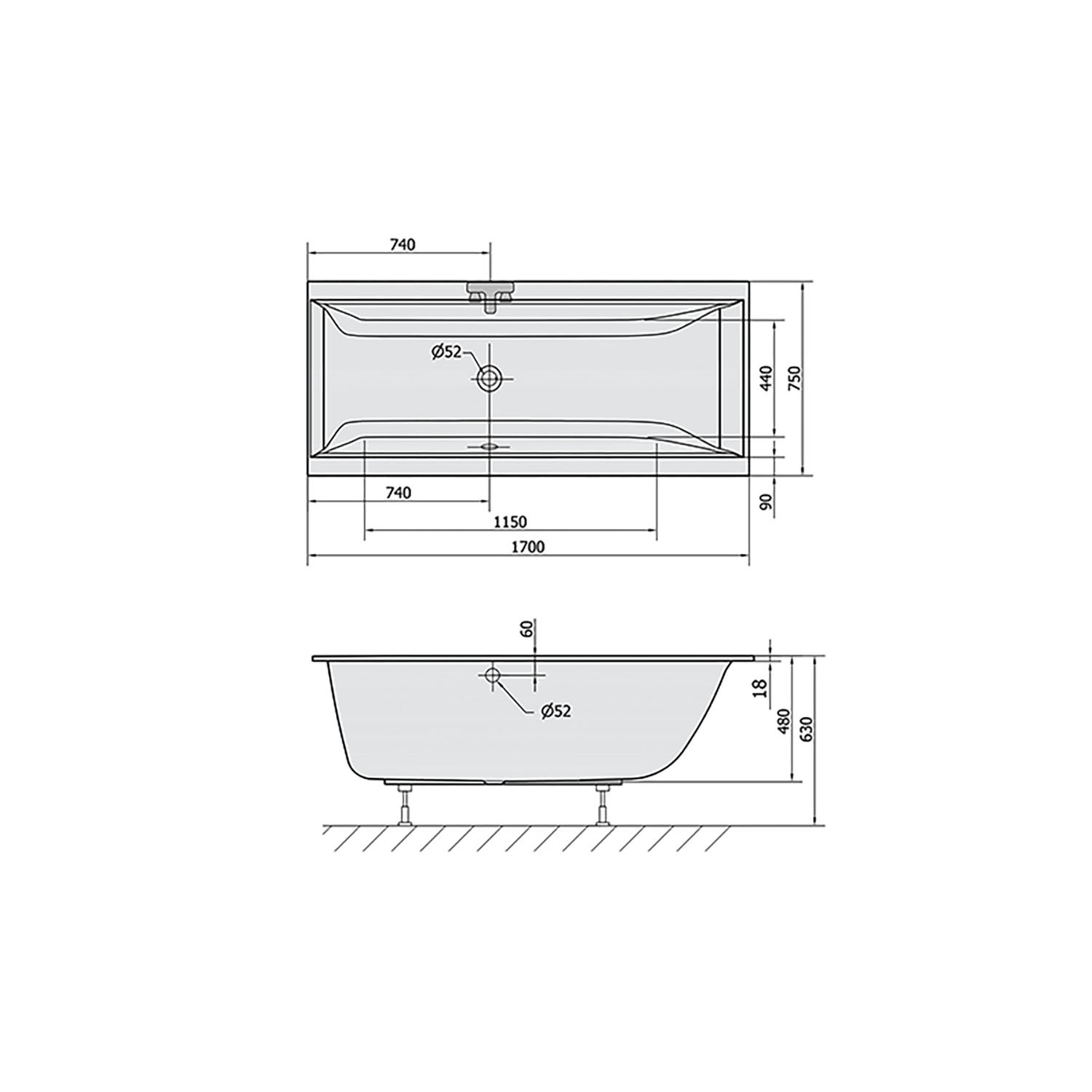 Het bad heeft een lengte van 170 cm, een breedte van 75 cm en een totale hoogte van 48 cm. Het bad wordt geleverd exclusief sifon, waste en badpoten.