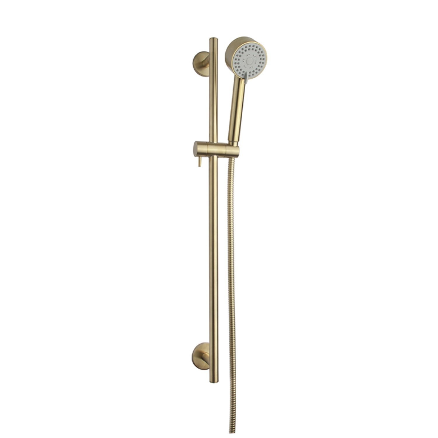De Cadans glijstangset van het merk Wiesbaden is een uitstekend toevoeging aan uw doucheruimte. De elementen uit deze set zijn gemaakt van messing en hebben een afwerking in de kleur geborsteld messing. Naast een glijstang bestaat deze set ook uit een bijpassende doucheslang en handdouche. Dit artikel heeft een hoogte van 75 cm en een breedte van 12,2 cm. Met behulp van het standaard meegeleverde montagemateriaal is deze set eenvoudig te monteren!