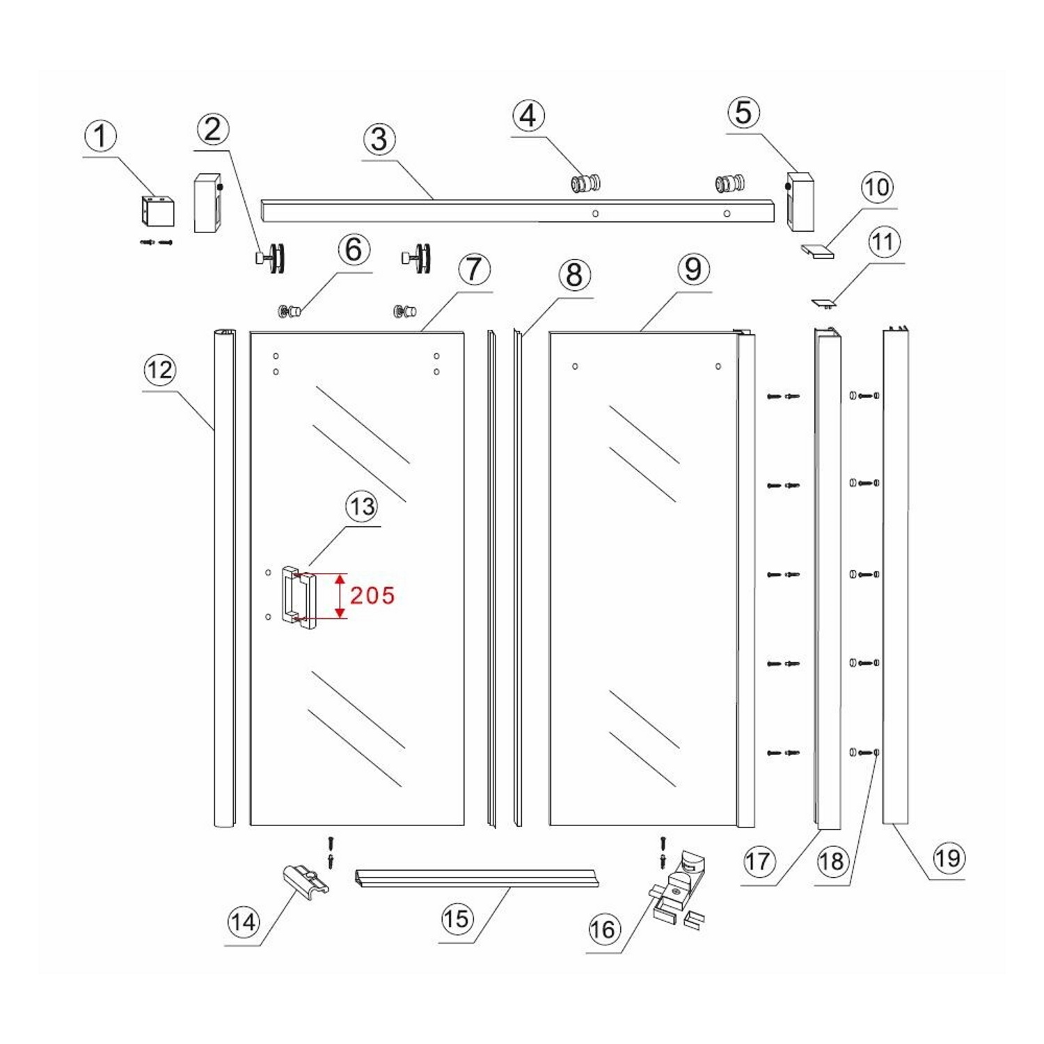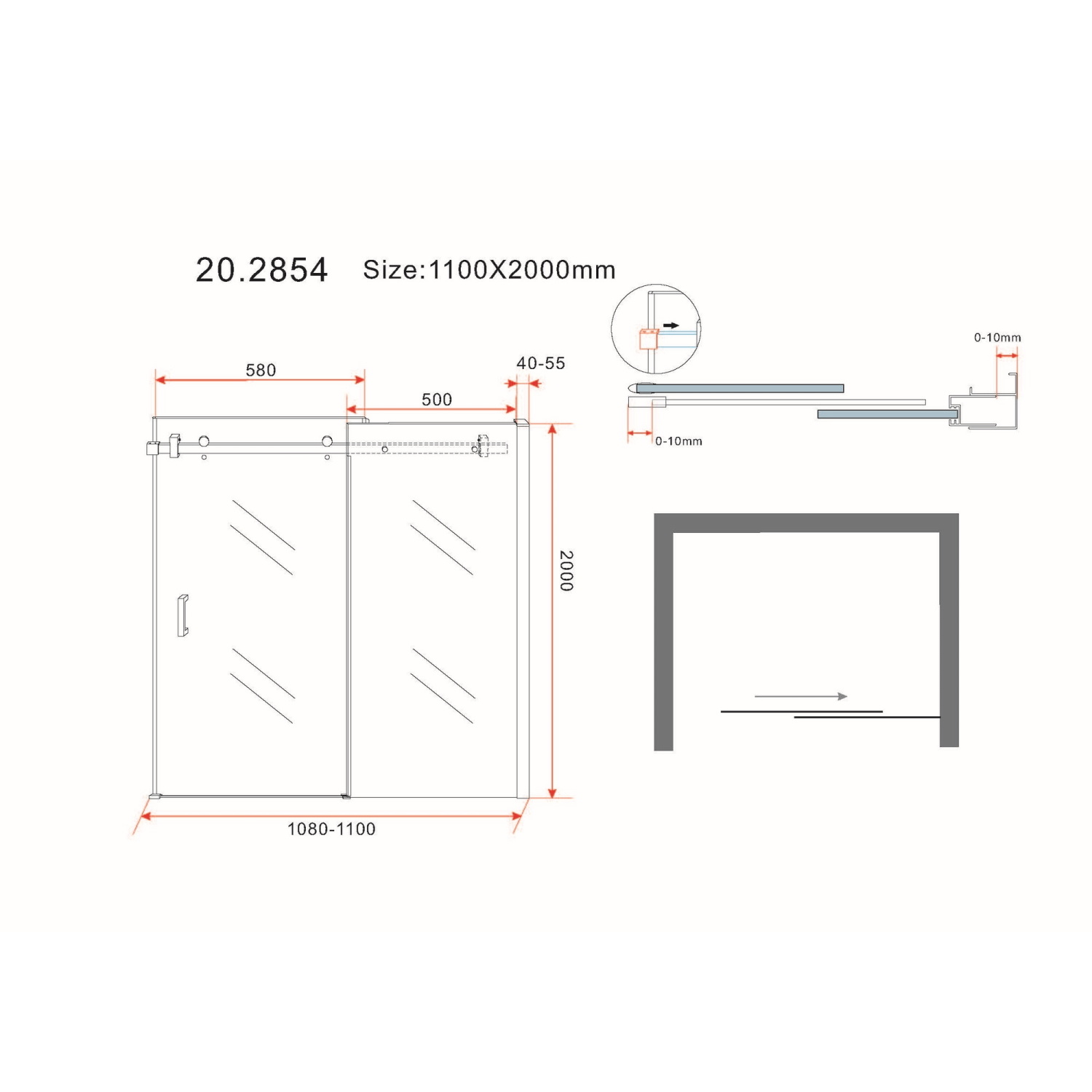 De douchedeur kent een breedte van 110 cm en een hoogte van 200 cm. De ophanging van het artikel gebeurt door middel van grote RVS wielen.