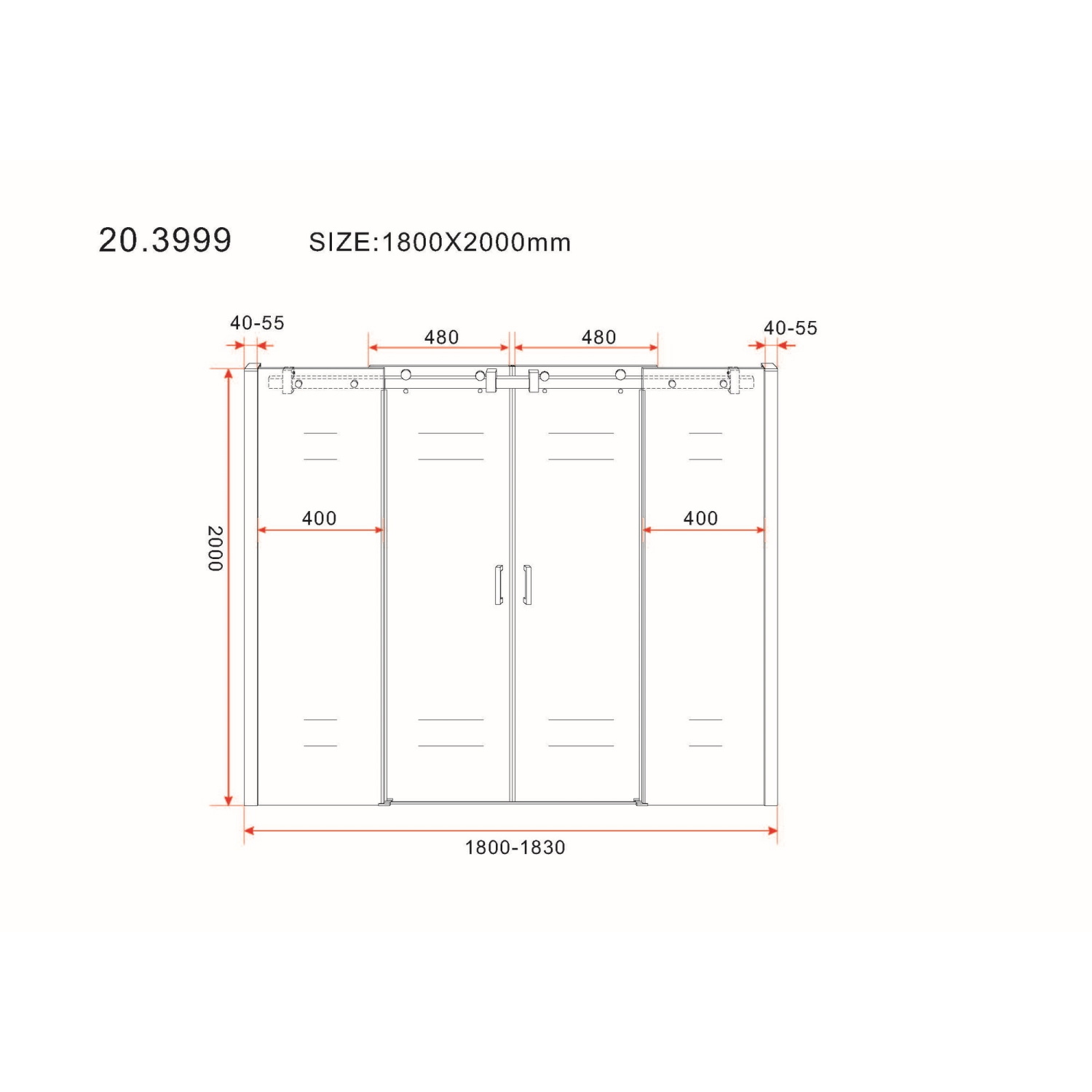 De douchedeur kent een breedte van 180 cm en een hoogte van 200 cm. De ophanging van het artikel gebeurt door middel van grote RVS wielen. Het heldere glas kent een dikte van 8 mm en is voorzien van NANO Coating veiligheidsglas.